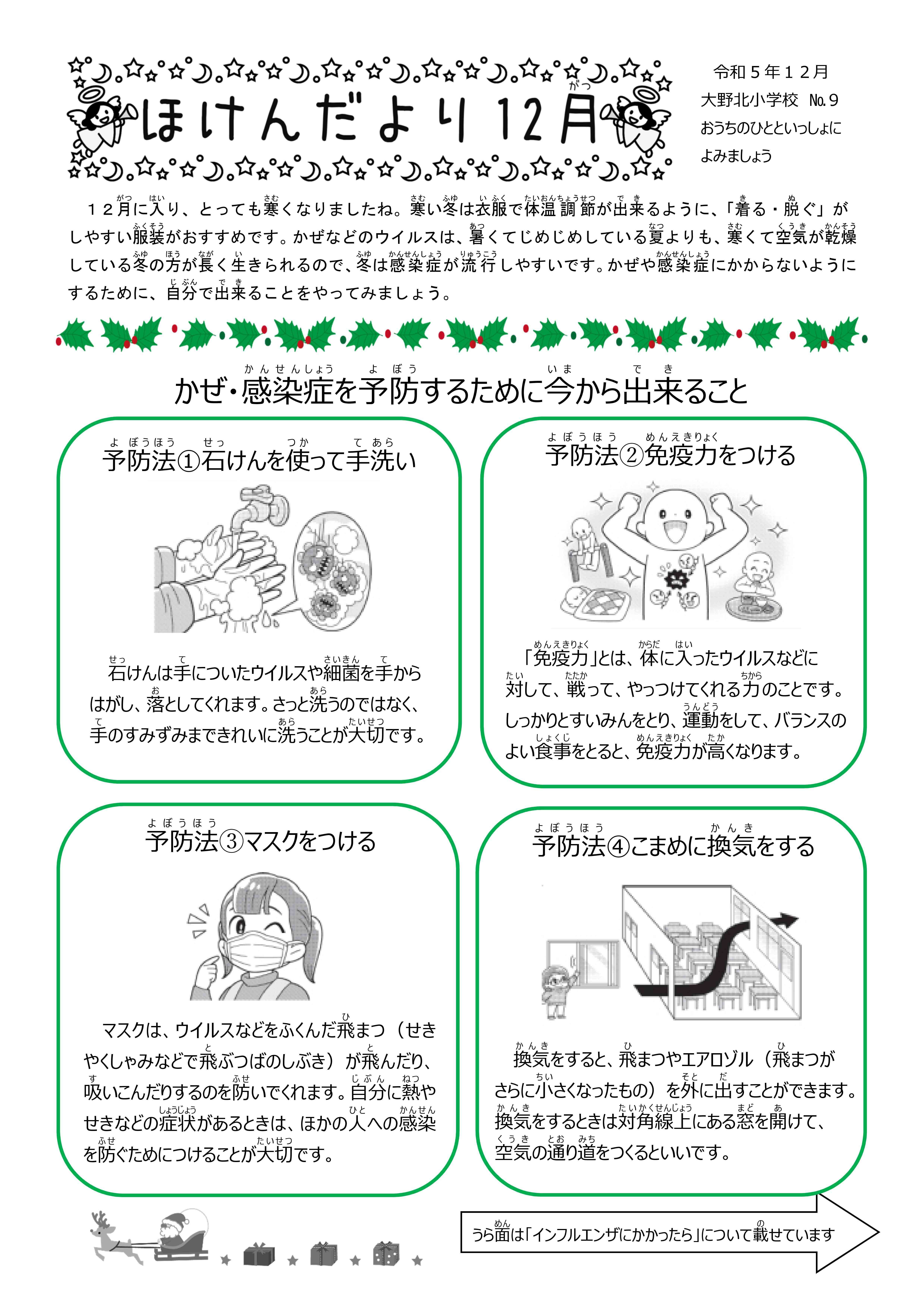 12月に入り、とっても寒くなりましたね。冬は感染症が流行しやすく、大野北小学校でも熱や風邪症状で欠席する人が増えてきました。かぜや感染症にかからないようにするために、換気や手洗いなど自分で出来ることをやってみましょう。 学校でも引き続き感染対策に努めてまいりますが、ご家庭でも朝の健康観察のご協力をよろしくお願いいたします。
