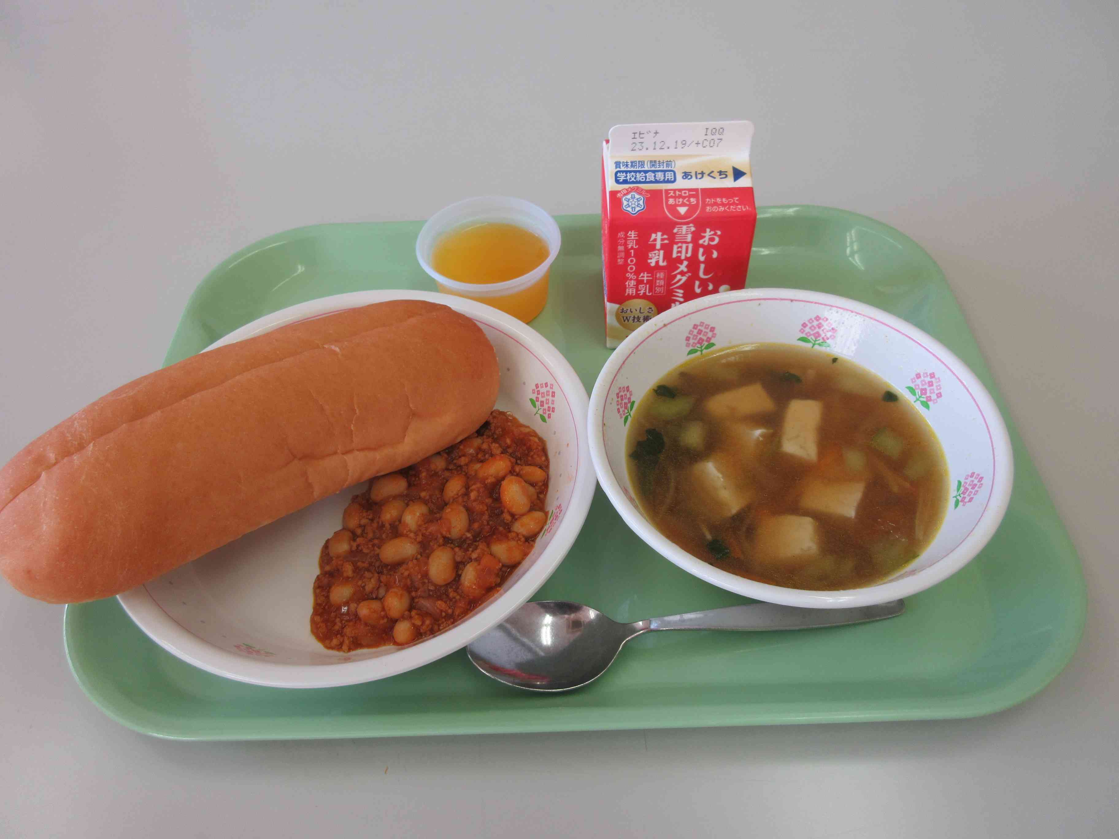 今日の献立は、コッペパン、チリコンカーン、鶏ごぼうスープ、みかんゼリー、牛乳です。 みかんゼリーは給食室の手作りです。大野北小には、うんしゅうみかんの木があります。のぞみ級のお友だちがみかん狩りをしてくれました。191個、21キロもありました。給食室で、そのみかんをよく洗って皮をむいて、ジュースを絞って、みかんゼリーを作りました。みかんにはみんなの体を元気にしてくれるビタミンCやクエン酸がたくさん含まれています。 みかんは、体の調子を整えるみどりのなかまの食べ物です。【添付ファイル】