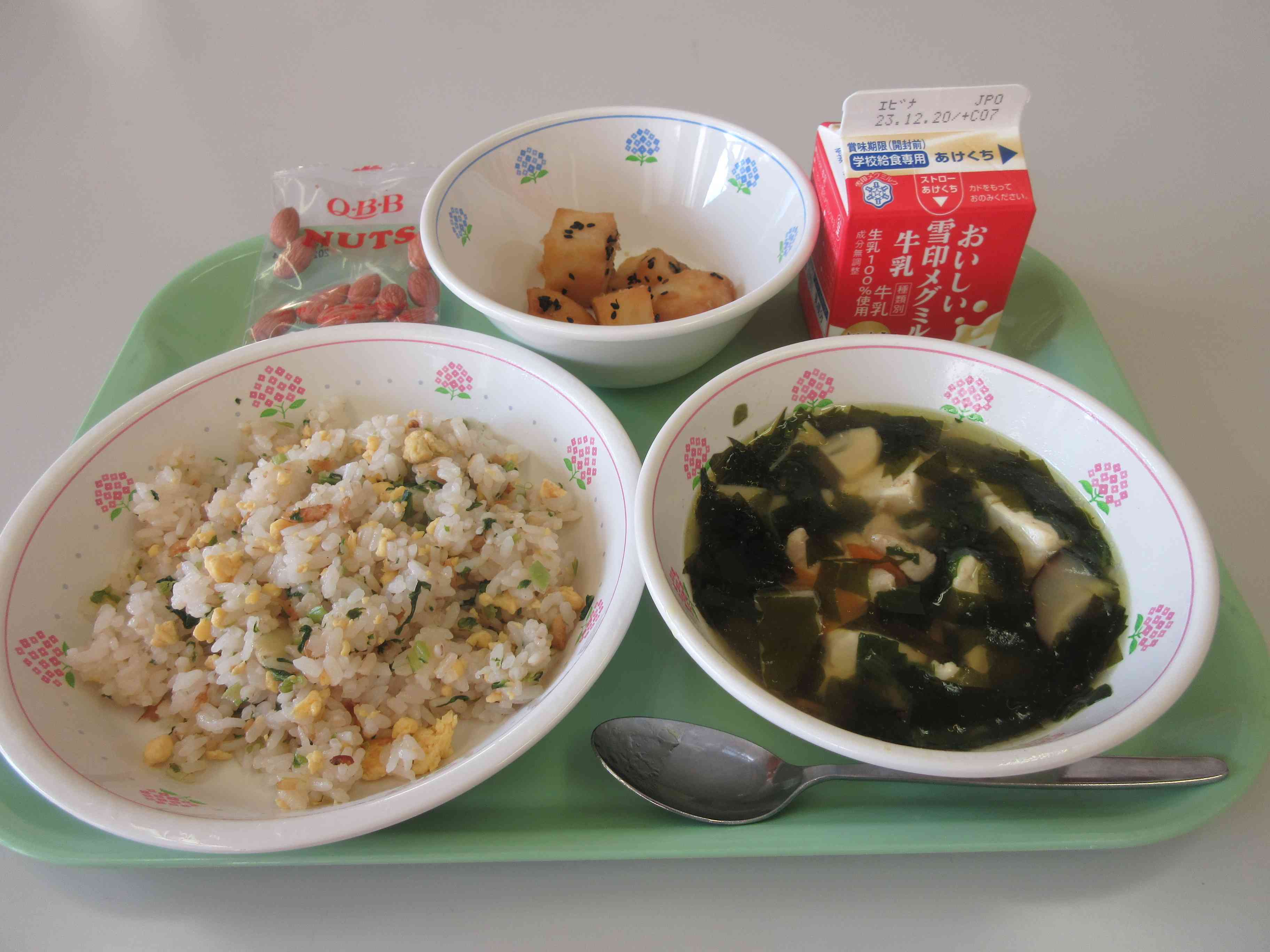 今日の献立は、さがみ菜チャーハン、わかめスープ、ざぜんいも、アーモンド、牛乳です。 さがみ菜チャーハンのさがみグリーンと卵は相模原市内産、小松菜は神奈川県内産です。 チャーハンは中華料理で「チャー」は炒める、「ハン」はごはんと言う意味です。ごはんに加える具材を変えることでいろいろなチャーハンができます。さがみ菜チャーハンには、さがみグリーンと卵、さくらえびが入っています。 ごま油は、熱や力のもとになるきいろのなかまの食べ物です。【添付ファイル】