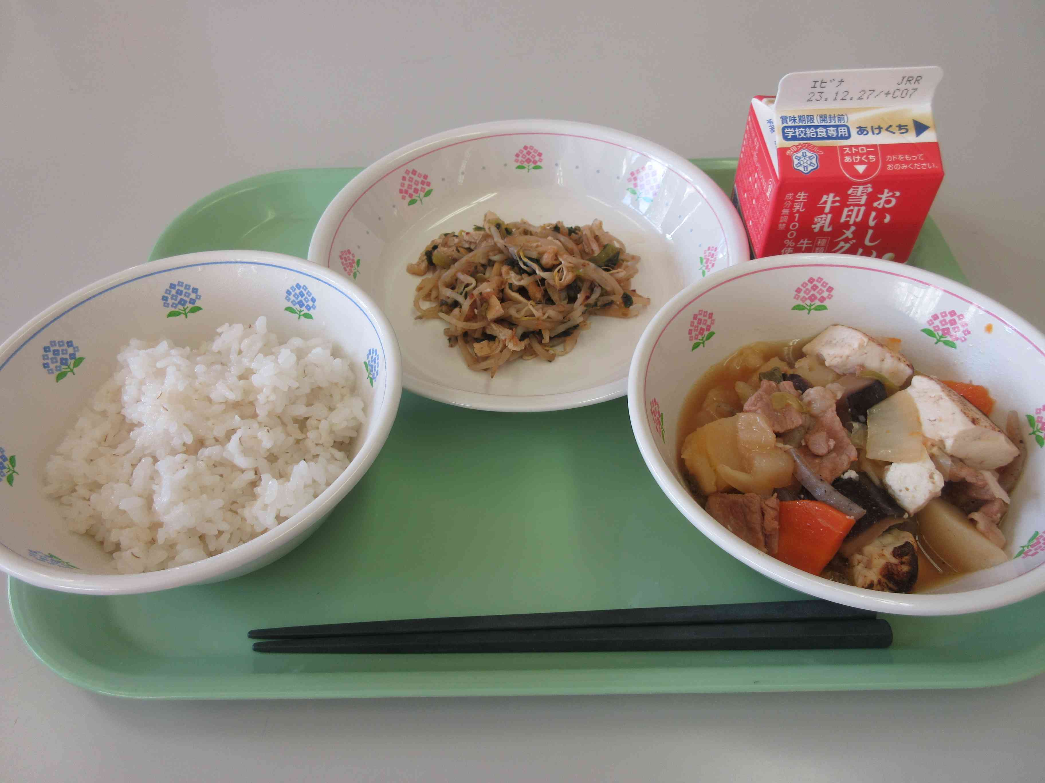 今日のこんだては、麦ごはん、すき焼き煮、もやしのおかかあえ、牛乳です。 小松菜は神奈川県内産です。 すき焼きは、江戸時代に土を掘り起こす農具「すき」の上に、たれを漬け込んだカモやタカなどの肉を焼いて食べたのが始まりといわれています。豚肉、焼き豆腐、長ねぎ、じゃがいも、白菜、しいたけ、にんじん、こんにゃくなど具だくさんのすき焼き煮は、麦ごはんと一緒に食べてください。 焼き豆腐は、体をつくるもとになる赤のなかまの食べ物です。【添付ファイル】
