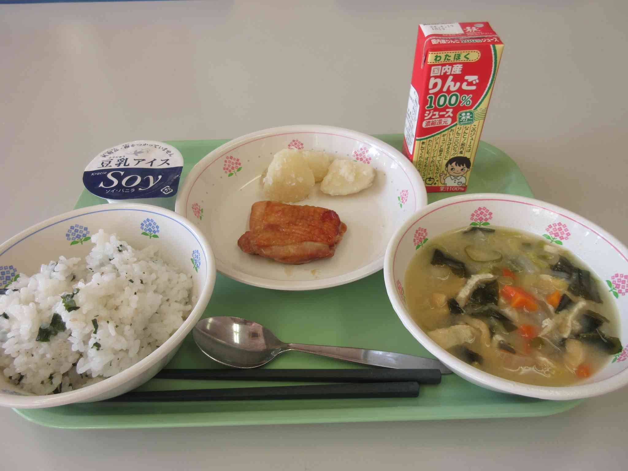 今日のお楽しみ給食のこんだては、わかめごはん、照り焼きチキン、粉ふきいも、白菜のみそ汁、りんごジュース、豆乳アイスです。 みそ汁にはハートや星などの形をしたラッキーにんじんが入っています。 もうすぐ冬休みですね。冬休みはおうちの人のお手伝いをたくさんしましょう。年越しそばやおせち料理、お雑煮などの行事食もぜひおうちで味わってください。学校や給食がなくても1日3食しっかり食べて冬休みを元気にすごしてください。 お米は、熱や力のもとになるきいろのなかまの食べ物です。【添付ファイル】