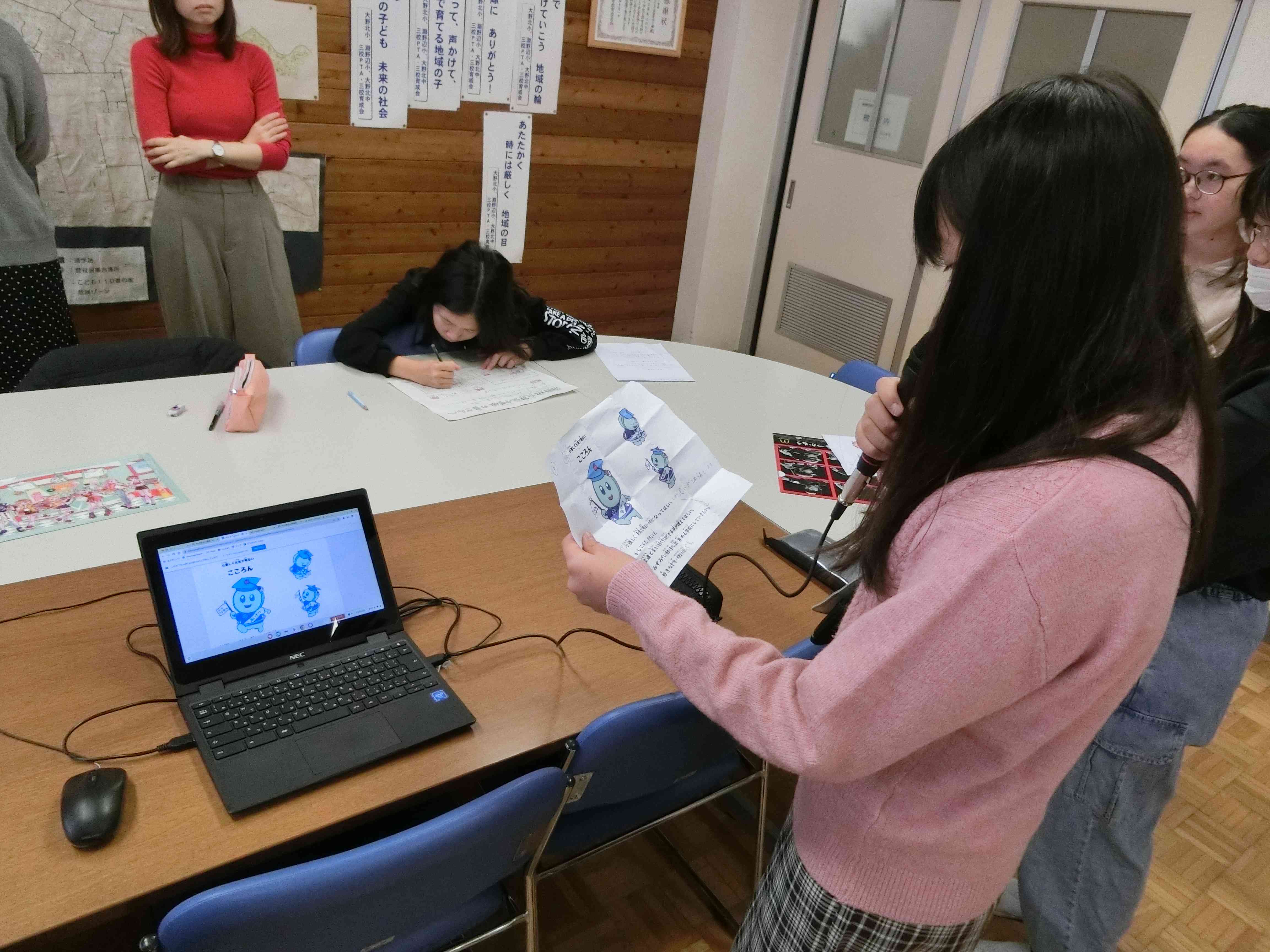 50周年に向けて子どもたちが制作した「周年マスコットキャラクター」の最終投票に向けての説明を計画委員会の子どもたちが行いました。 いよいよ全校投票で決定となります。