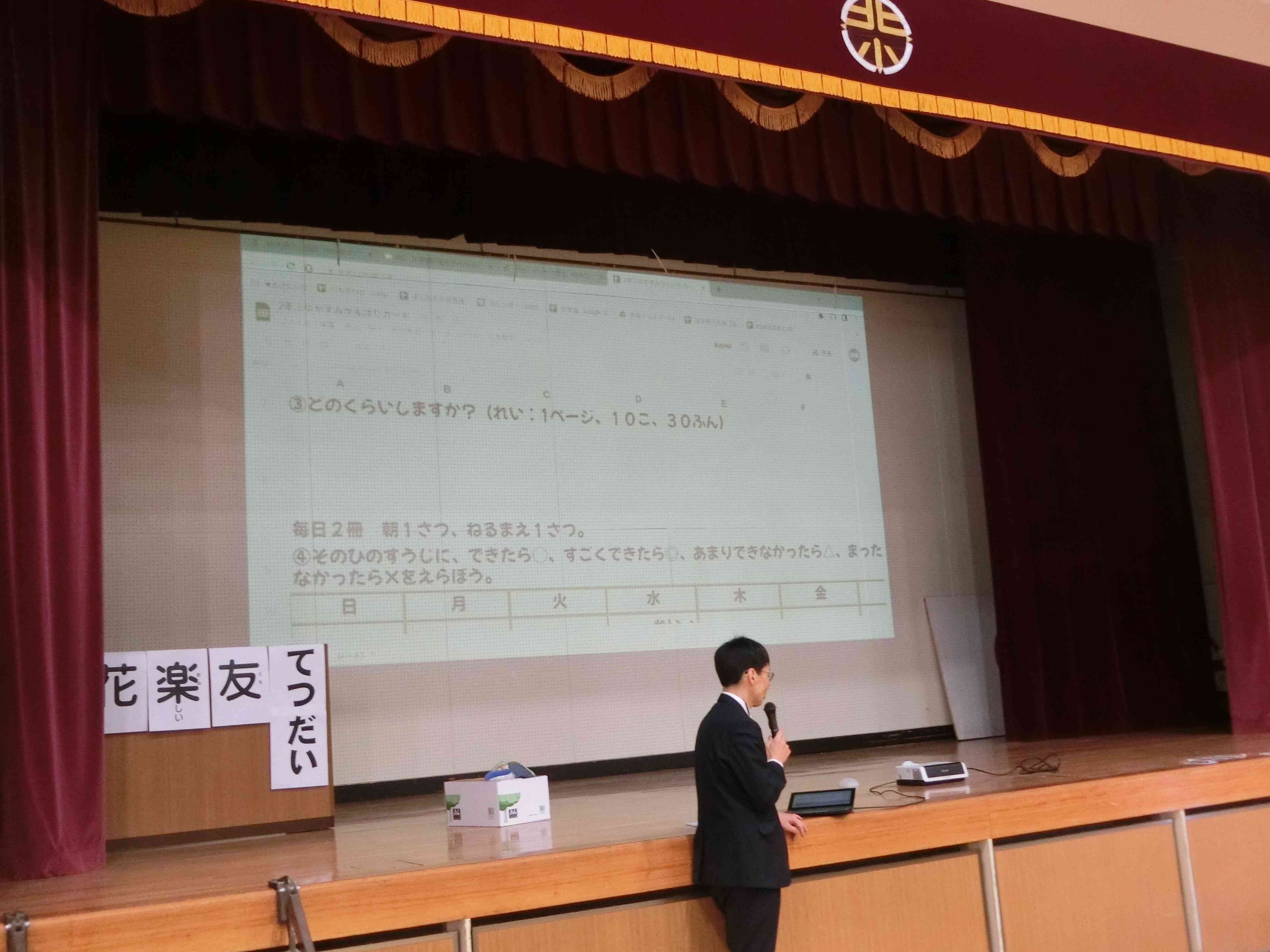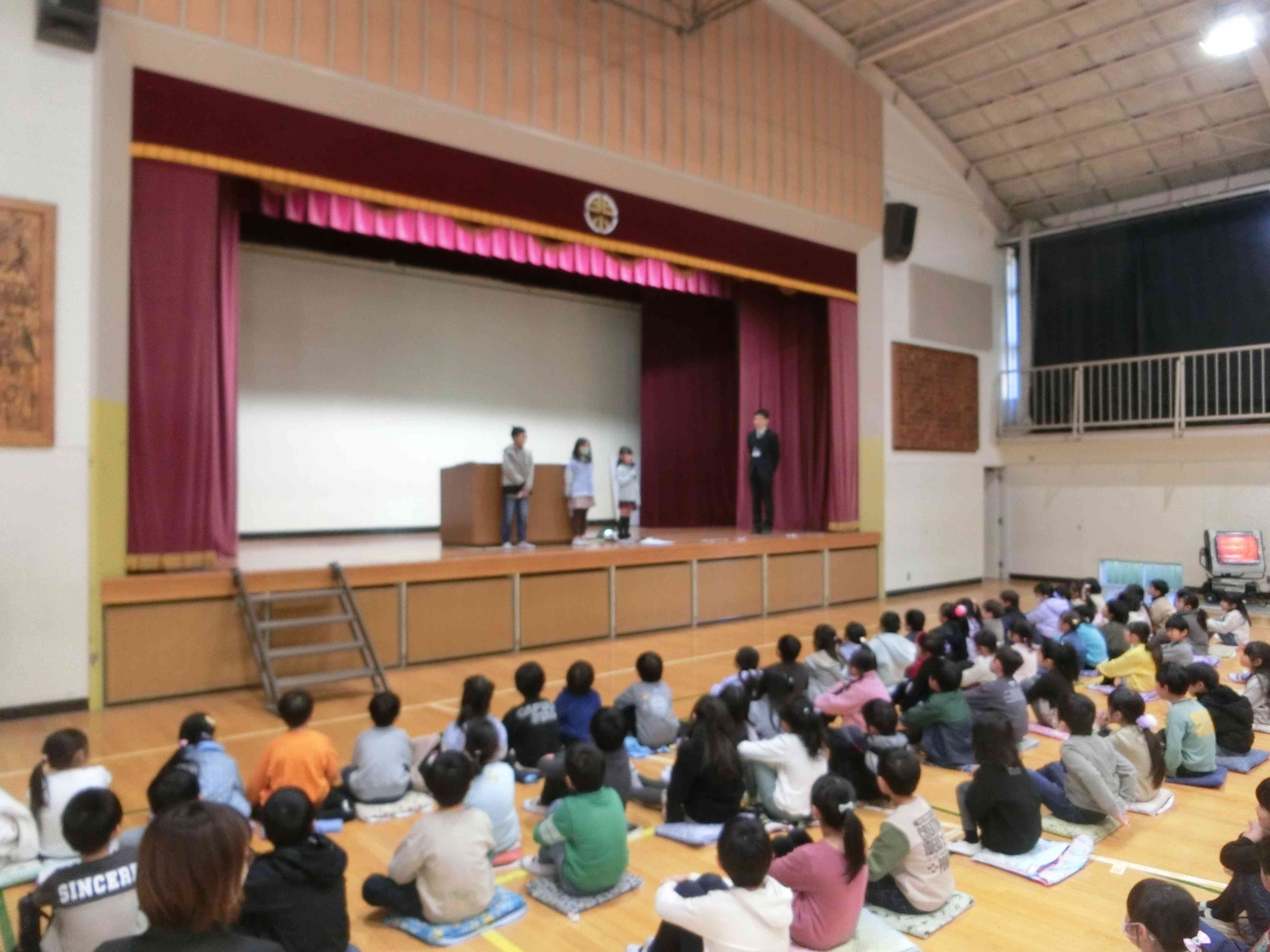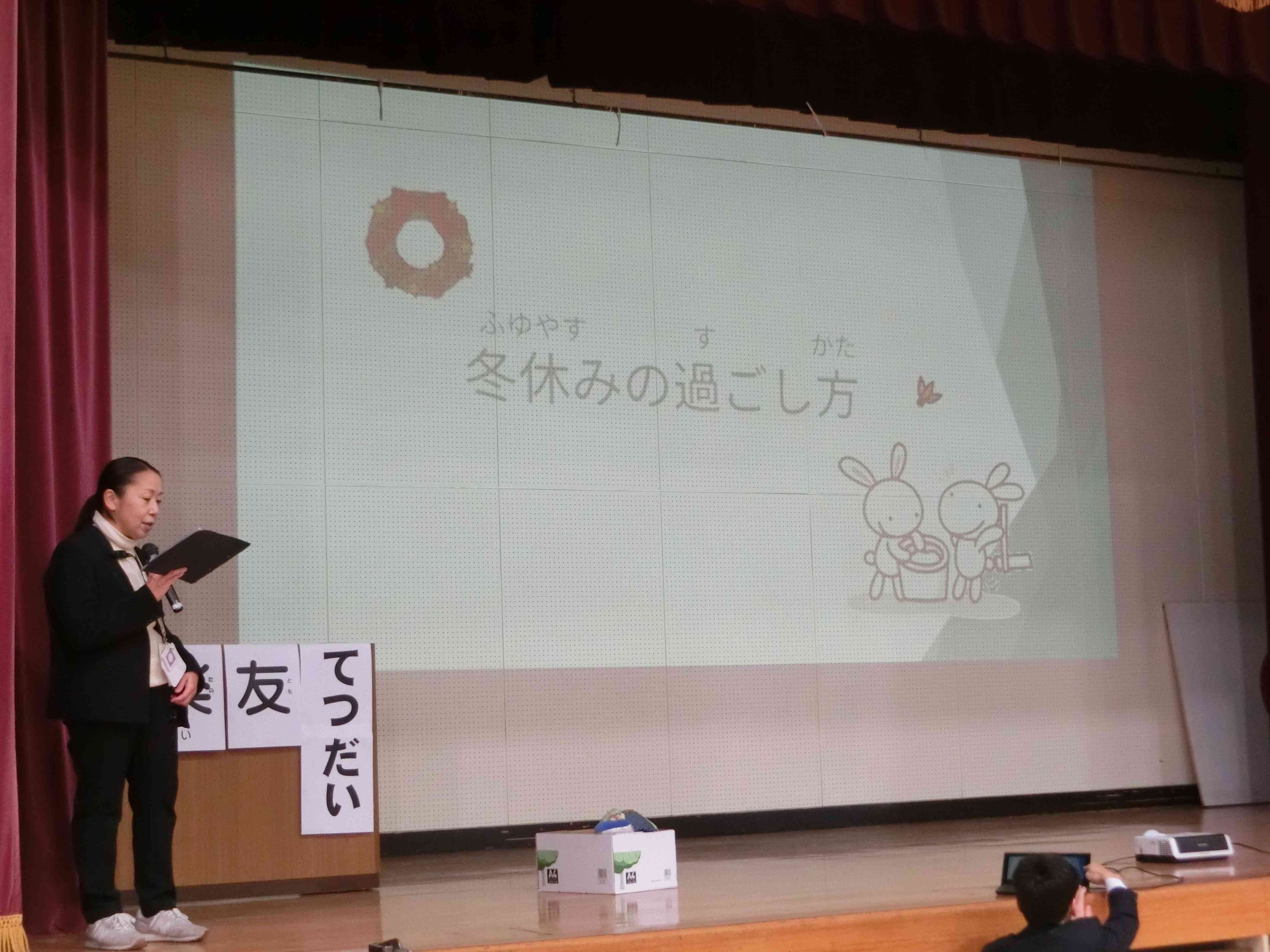 第2学期終業式を行いました。 次のようなハイブリッドの形で実施しました。 1・3・5年生は体育館で 2・4・6年生は各教室のTV放送で 校長先生からは子どもたちにアンケートを募集した「今年を表す漢字一文字」のお話と「継続は力なり」「お手伝い」についてお話がありました。 児童指導の先生から冬休みの過ごし方について、教務主任の先生から「冬休みのがんばりカード」についてお話がありました。 1・3・5年生の代表児童が2学期のがんばりやこれからのめあてを発表しました。【添付ファイル】
