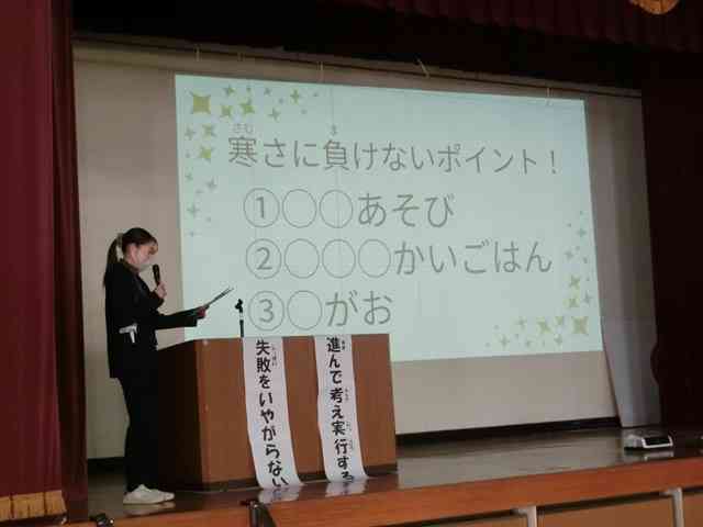 3学期の始業式を行いました。 校長先生から失敗をおそれずチャレンジしたり継続したりすること、進んで考え実行することについてお話がありました。 2・4・6年生の代表児童が目標などを発表しました。 生活目標「寒さに負けない体をつくろう」について養護の先生からお話がありました。