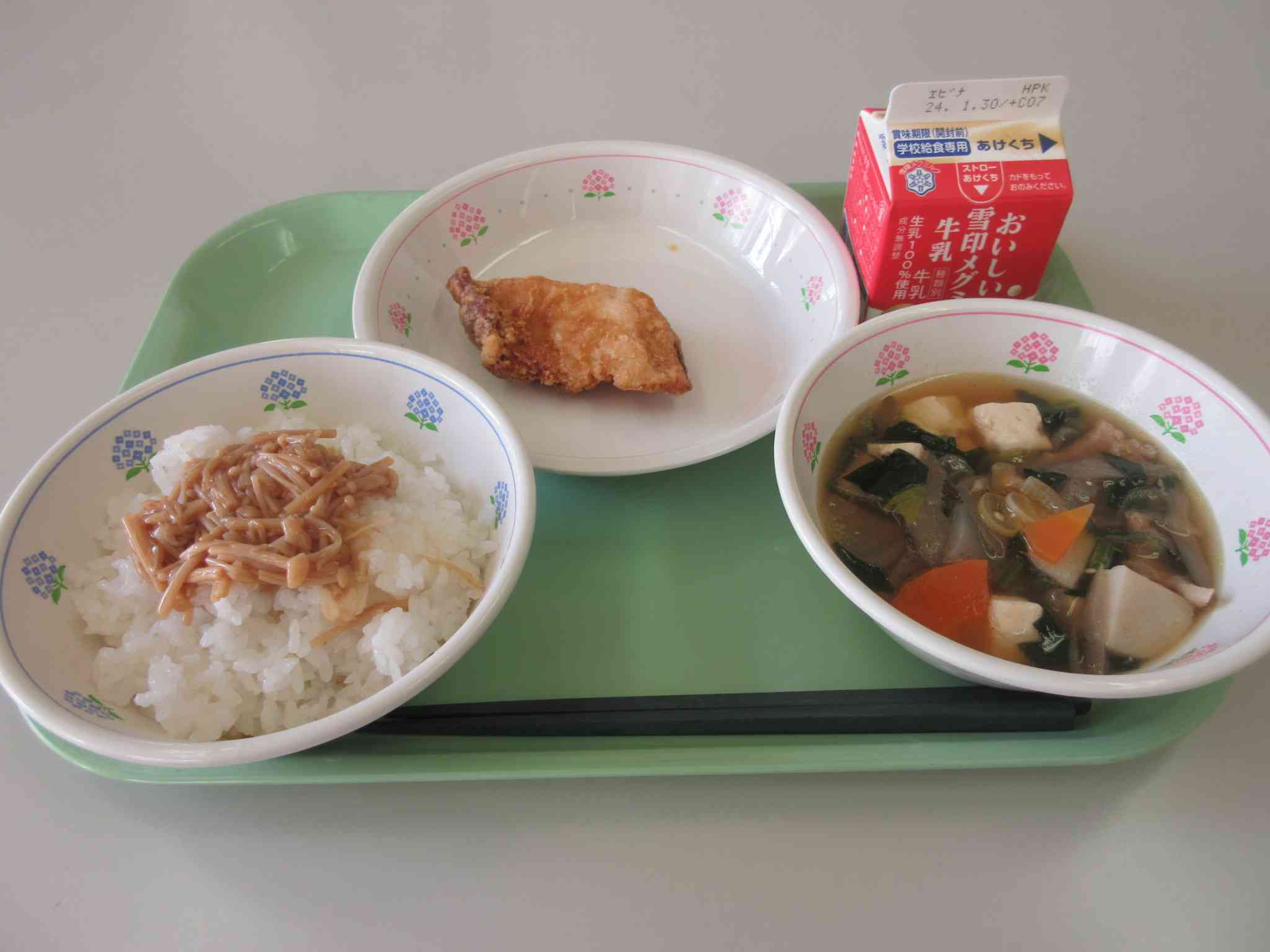 今日のこんだては、ごはん、ほっけのたつた揚げ、けんちん汁、手作りなめたけ、牛乳です。 けんちん汁に入っている大根は神奈川県内産です。 なめたけは、えのきたけというきのこを小さく切って、しょうゆとみりん、お酒でよく煮て作りました。えのきたけには、体の疲れをとってくれるビタミンB1や、おなかの中をきれいにそうじしてくれる食物繊維がたくさん含まれています。 えのきたけは、体の調子を整えるみどりのなかまの食べ物です。