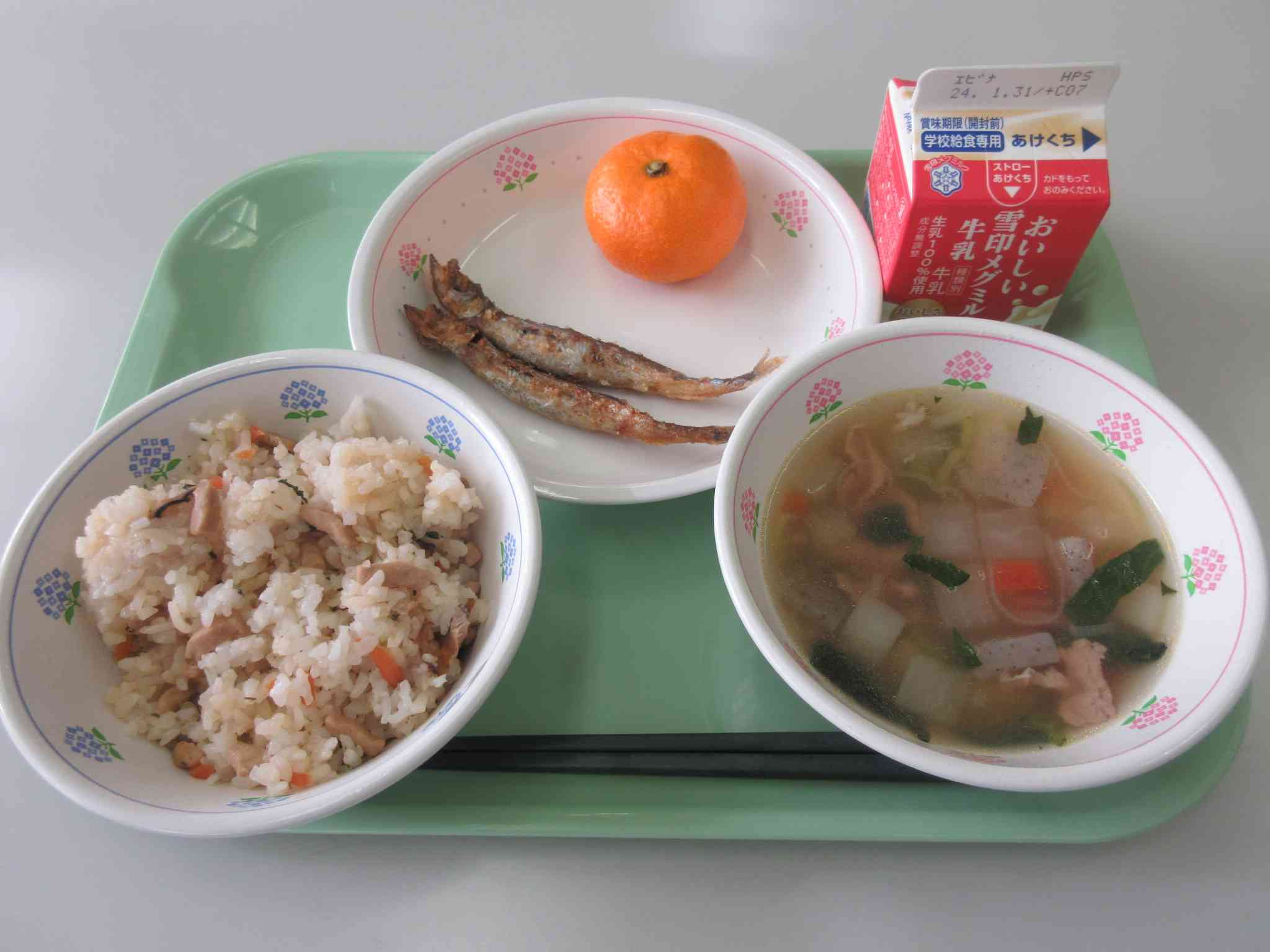 今日のSDGs給食のこんだては、かやくごはん、ししゃものからあげ、コロコロ塩豚汁、みかん、牛乳です。 人参は相模原市内産、大根と小松菜は神奈川県内産です。 かやくごはんのお米は、相模原市の防災備蓄米です。食べられる期限がせまってきているものを交換するため、給食にいただきました。コロコロ塩豚汁の豚肉は、給食から出た生ゴミをエサにして、そのエサを食べて神奈川県で育った豚さんの肉です。リサイクル、食品ロス、SDGsについて給食を通して一緒に考えてみましょう。 豚肉は、体をつくる赤のなかまの食べ物です。【添付ファイル】
