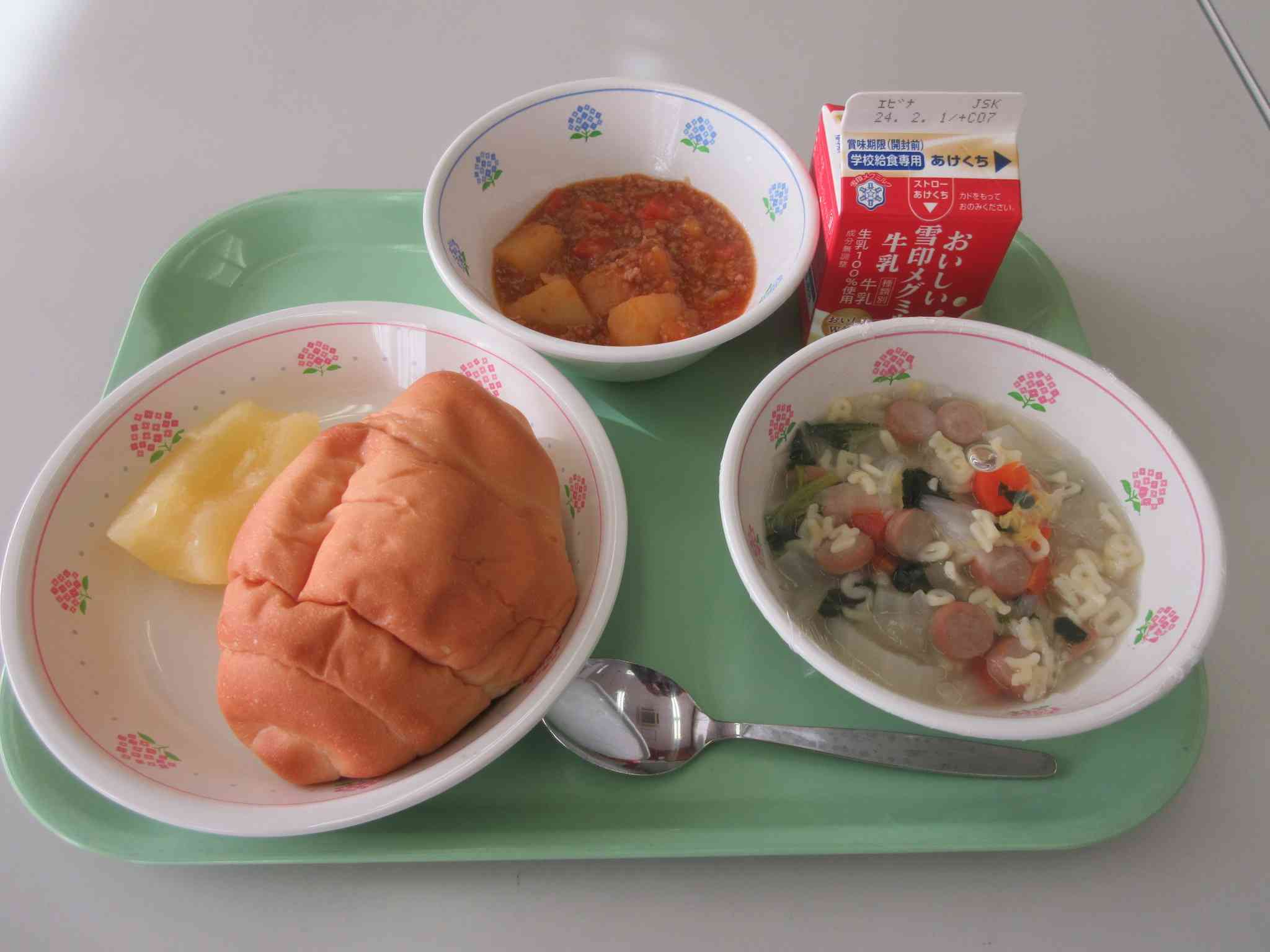 今日は6年3組のお友だちが考えてくれた給食で、こんだては、ロールパン、ギニリン、大根と白菜のABCスープ、牛乳です。 人参は相模原市内産、大根は神奈川県内産です。 ギニリンは、フィリピンの料理です。豚ひき肉に、じゃがいも、玉ねぎ、にんじん、トマト、にんにくが入っています。スープは冬においしい大根と白菜、ほうれん草が入っていて、みんなに人気のアルファベットマカロニも入れた楽しくておいしいスープを考えてくれました。6年生ありがとう。 大根は、体の調子を整えるみどりのなかまの食べ物です。【添付ファイル】