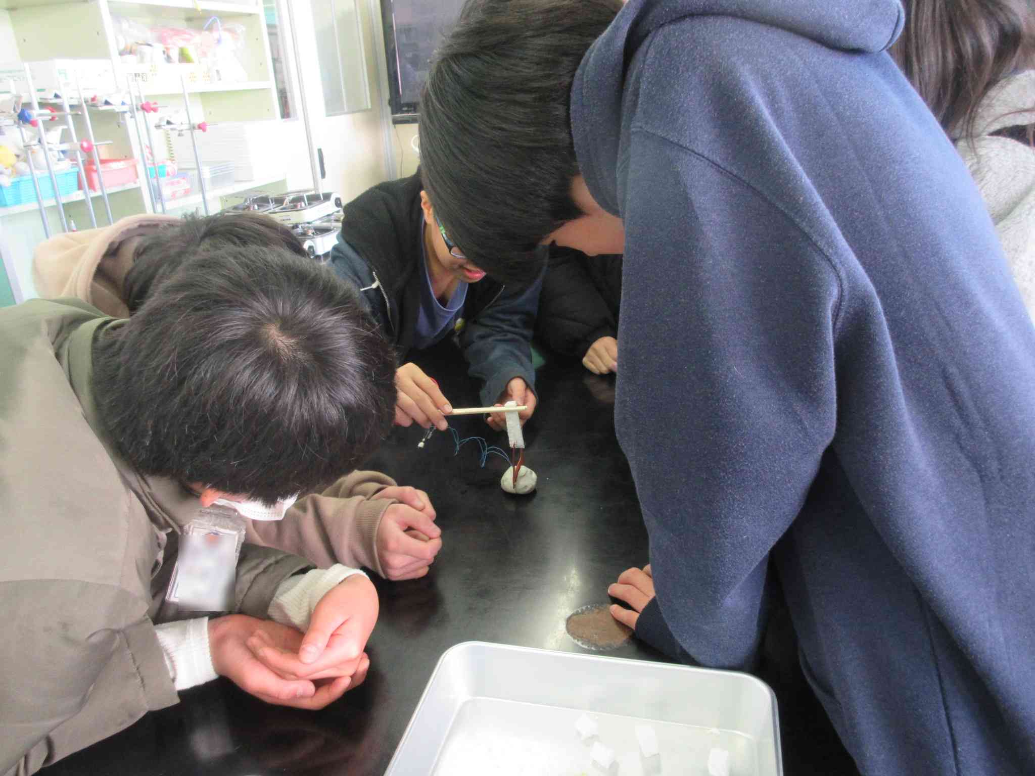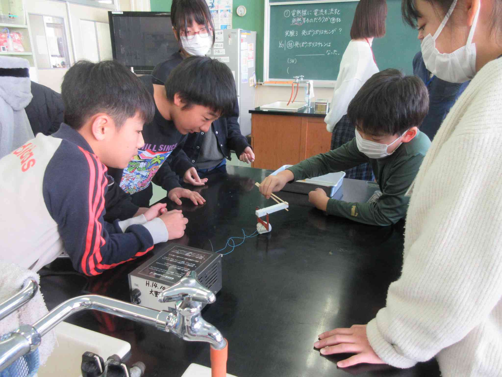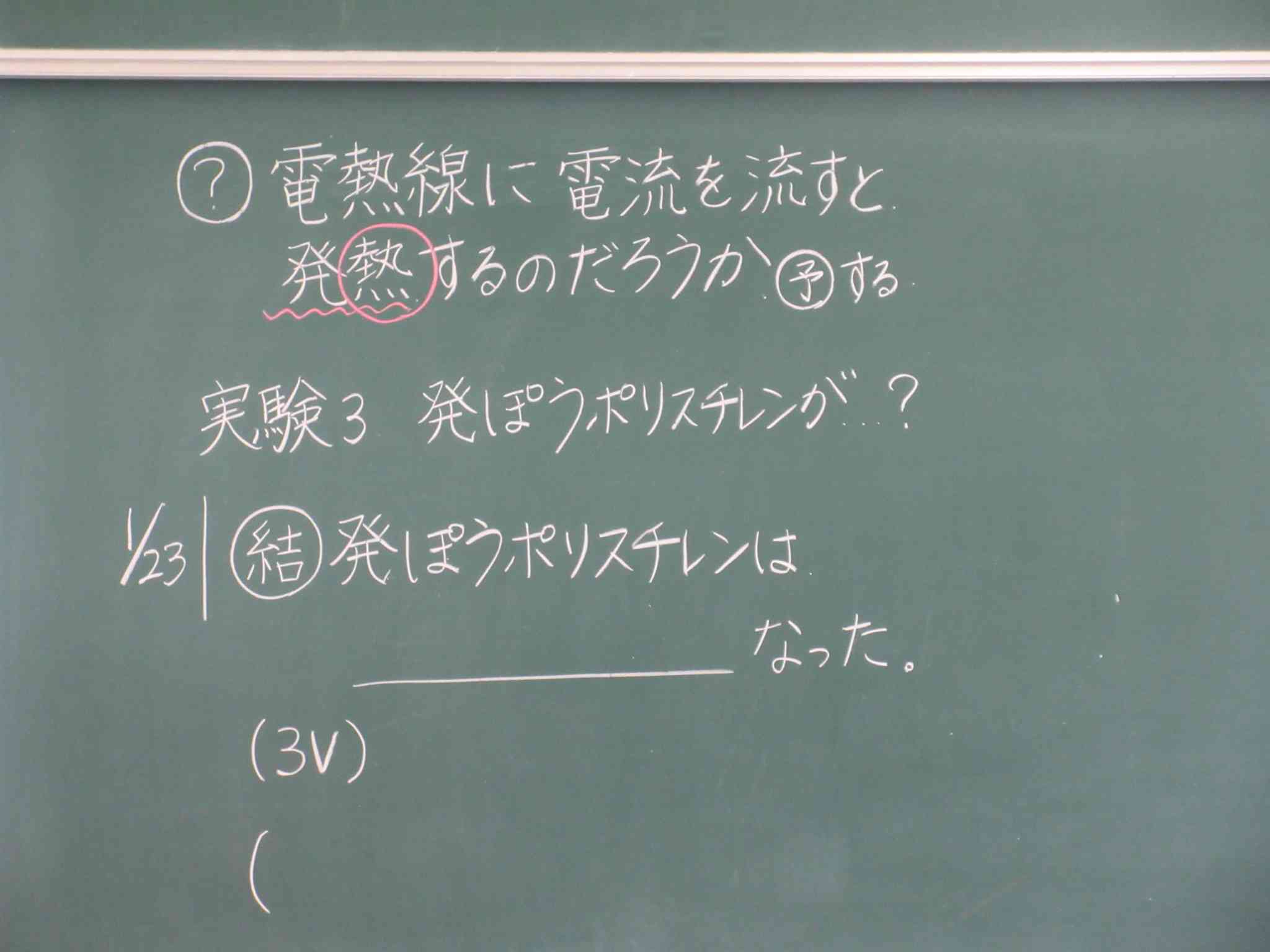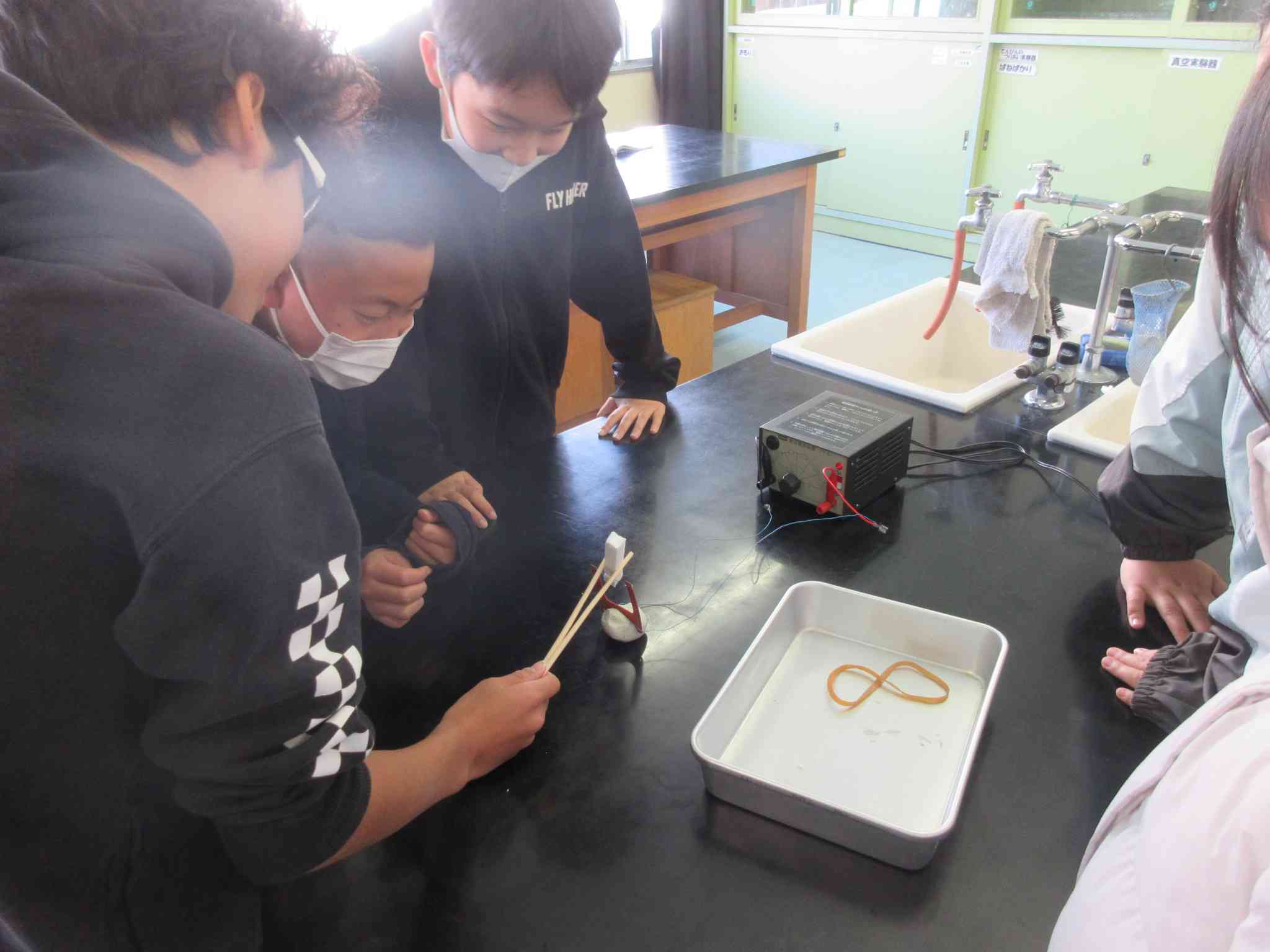 理科の実験で、 電熱線に電流を流すとどうなるか実験しました。 細く切った発表スチロールを近づけると・・ 「お~」 どこのグループでも声が上がっていました。