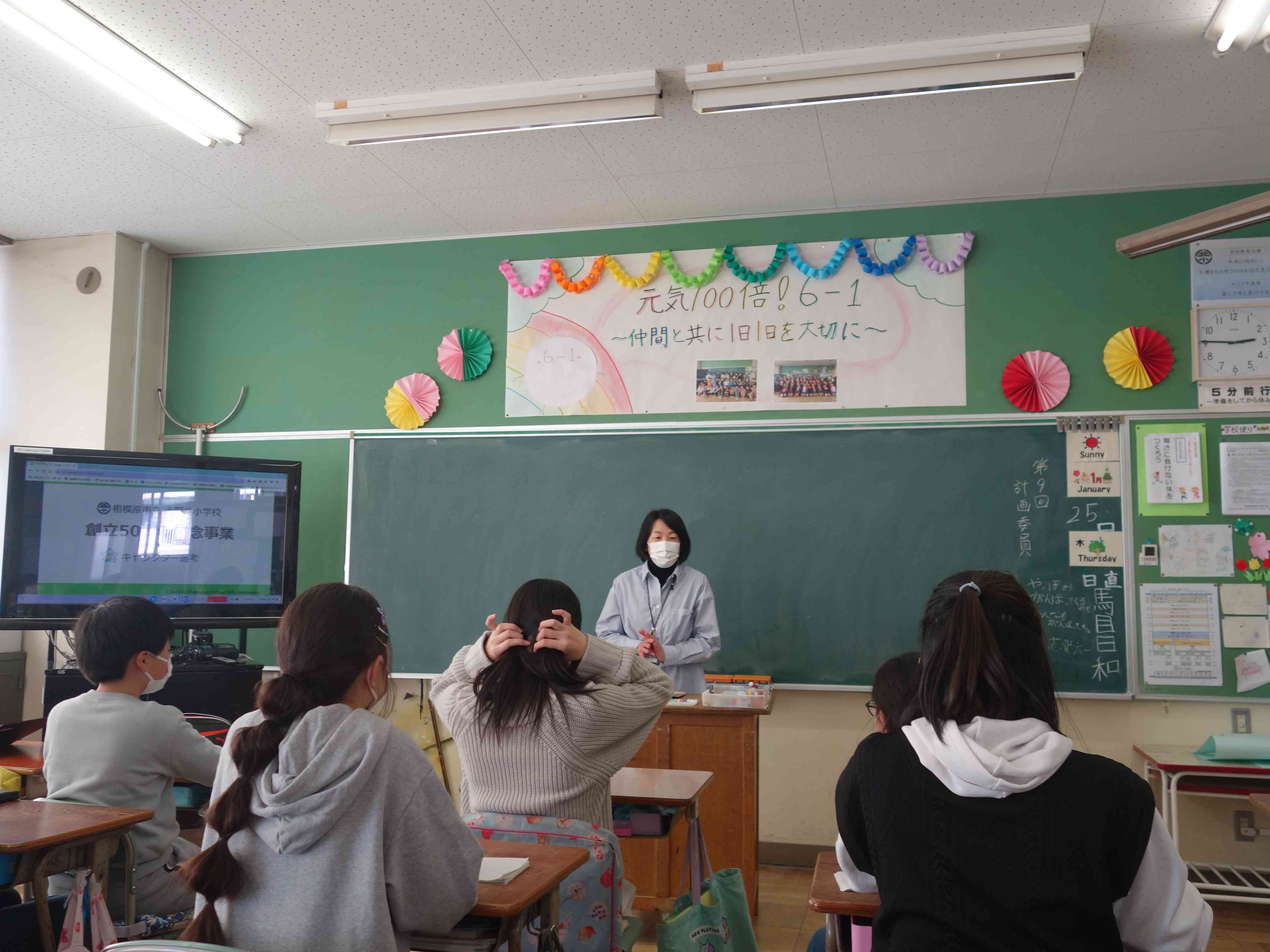 本日、50周年事業部の方が、計画委員会の子どもたちに投票で決まったキャラクターを発表しました。また、計画委員会の子どもたちから50周年事業部の方に投票で決まったスローガンを発表しました。1/31の朝会で計画委員の子どもたちがキャラクターとスローガンを発表します。