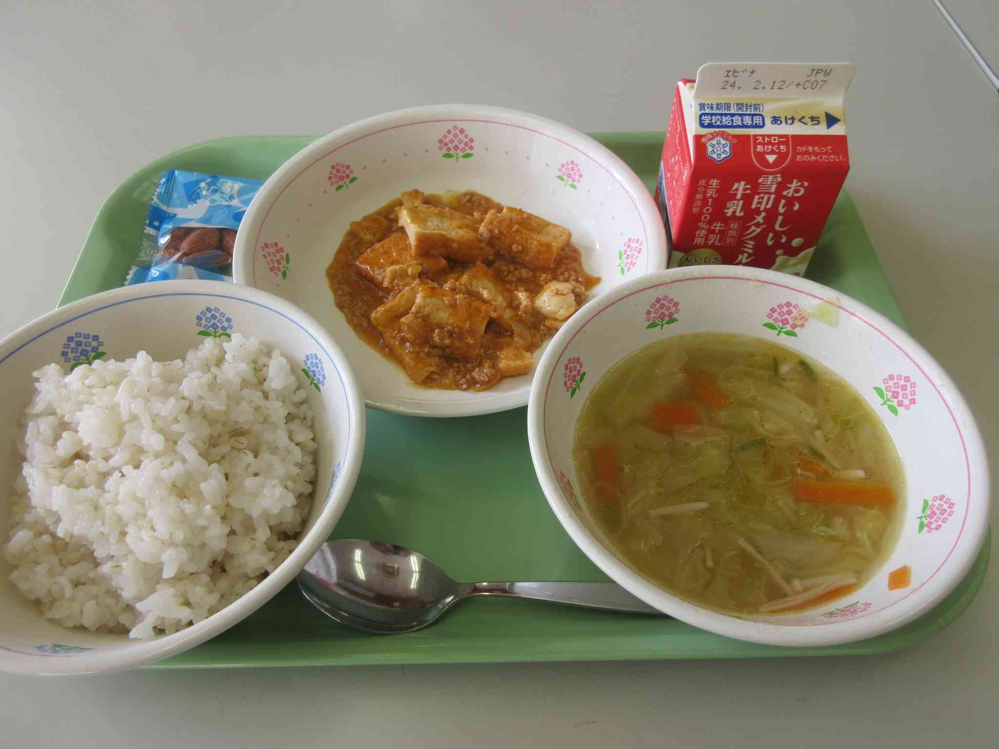 今日のこんだては、麦ごはん、生揚げの四川煮、キャベツの中華スープ、アーモンド、牛乳です。 キャベツは神奈川県内産です。 今日まで全国学校給食週間です。給食室には朝から八百屋さんや肉屋さん、豆腐屋さん、牛乳屋さんなどいろいろな人が給食に必要な食べ物を届けてくれています。13人の調理員さんが950人分のみんなの給食を作ってくれます。できるだけ残さず食べること、きれいに片付けること、あいさつをすることで感謝の気持ちを表しましょう。 生揚げは、体をつくる赤のなかまの食べ物です。【添付ファイル】