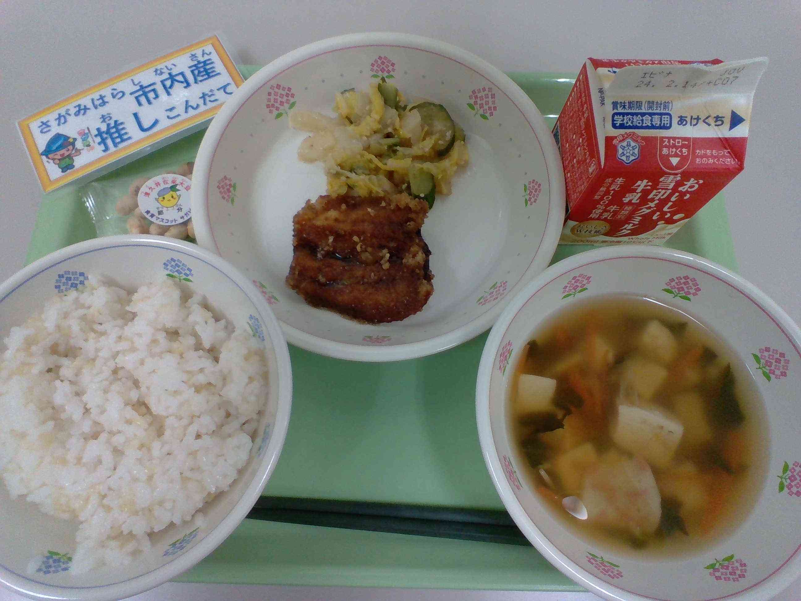 今日は節分豆まめ給食です。今日のこんだては、玄米ごはん、いわしのかばやき、ゆずの香りあえ、すまし汁、福豆、牛乳です。ゆずと福豆の大豆は相模原市内産です。今日は相模原市内産推しこんだてです。 節分には、豆をまいたり、鬼のきれいなにおいのするいわしをひいらぎに刺して玄関に飾ったりします。今日は節分にちなんで、いわしのかばやきにしました。福豆は、まぼろしの大豆といわれる津久井在来大豆で作られたものです。よくかんで食べて大豆の美味しさを味わってください。 いわしは、体をつくる赤のなかまの食べ物です。【添付ファイル】
