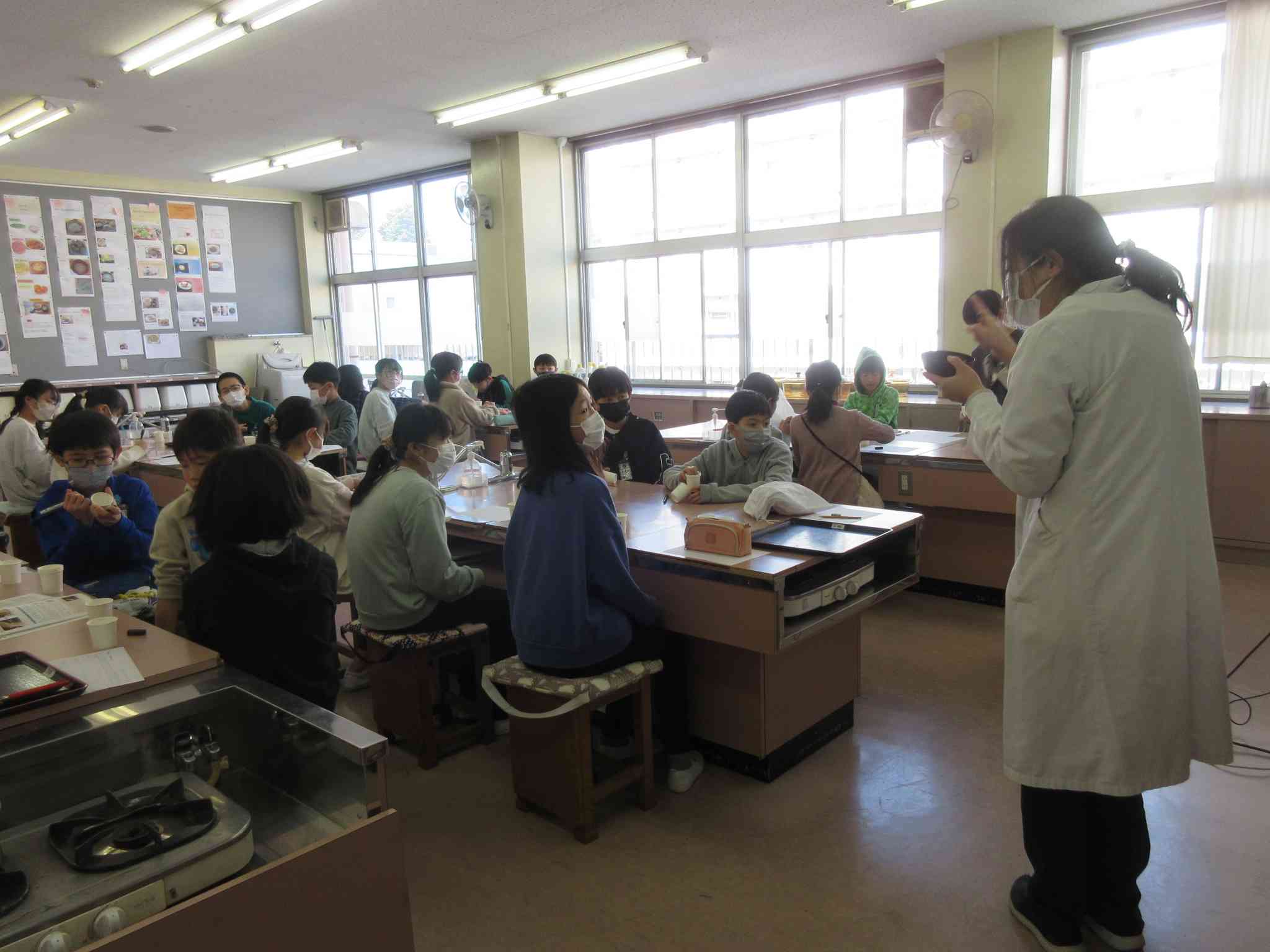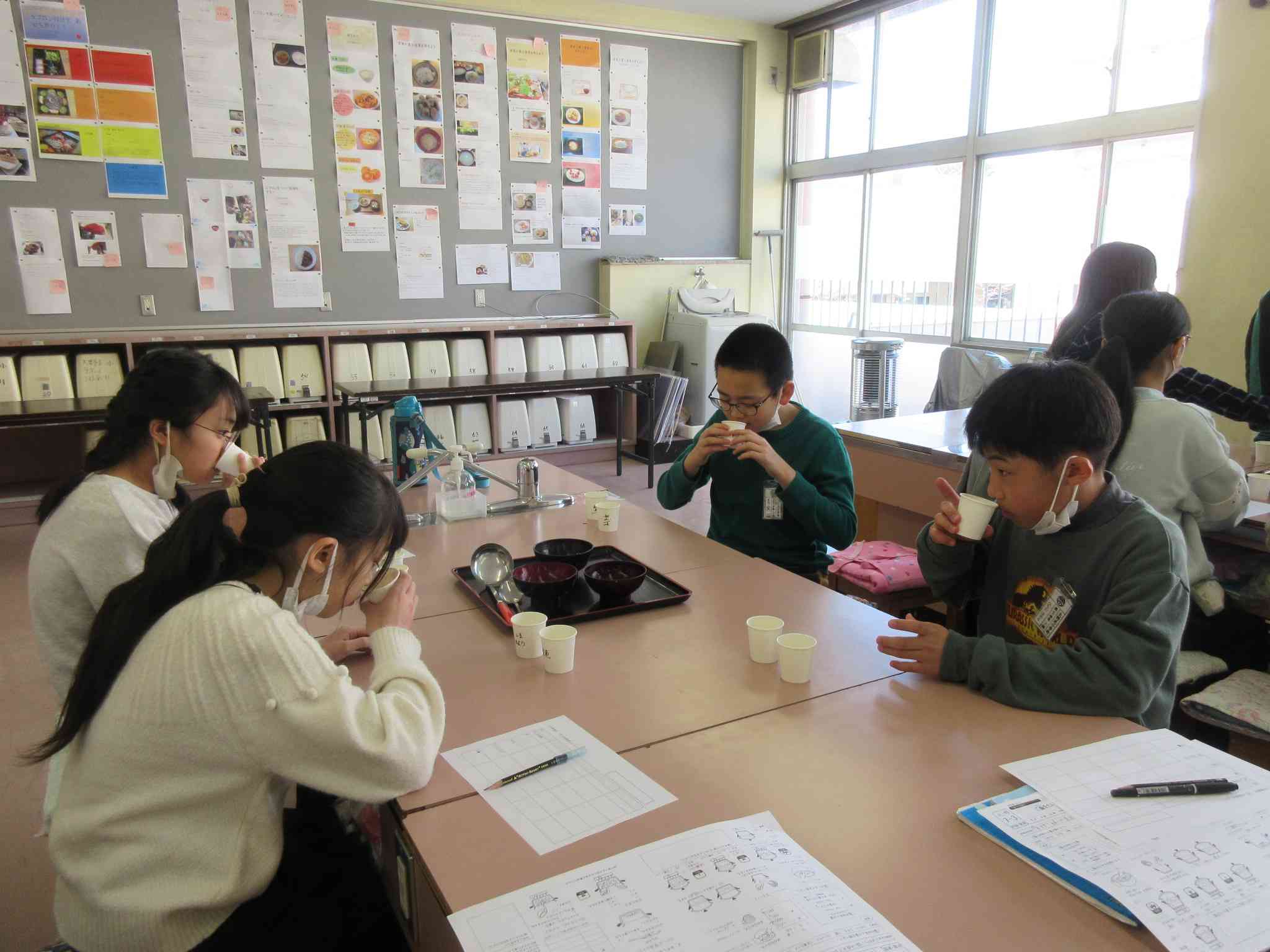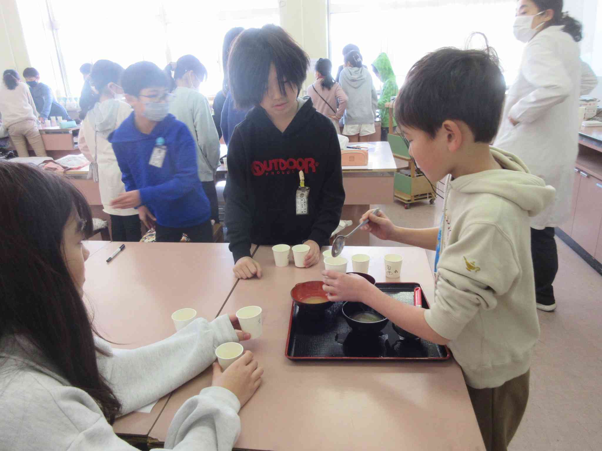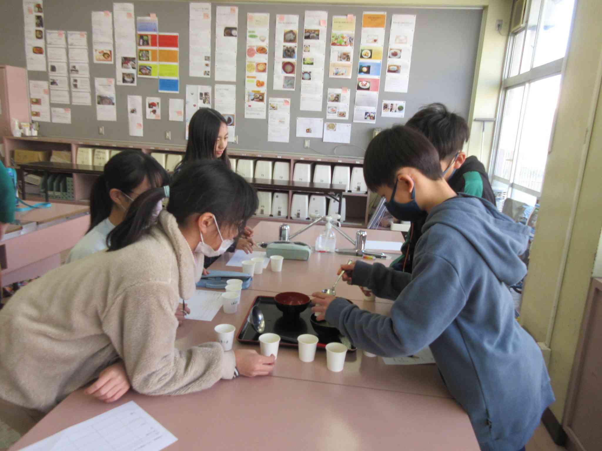 5年生の家庭科で、ごはんとみそ汁の調理実習があります。 その前に・・・ みそ汁のだしについて学習しました。 かつお節やこんぶ、調味だし、だしなし等のみそ汁を試飲して、 だしの風味を味わいました。