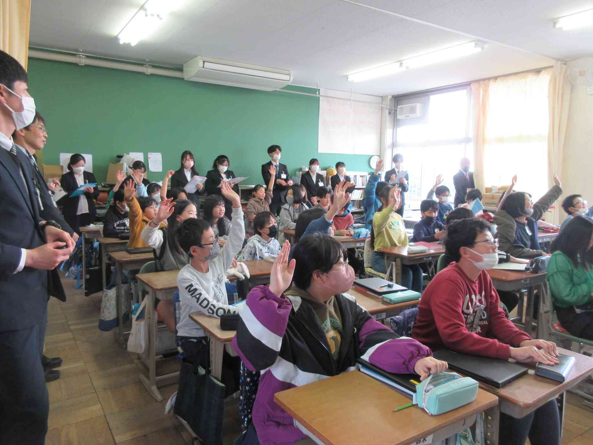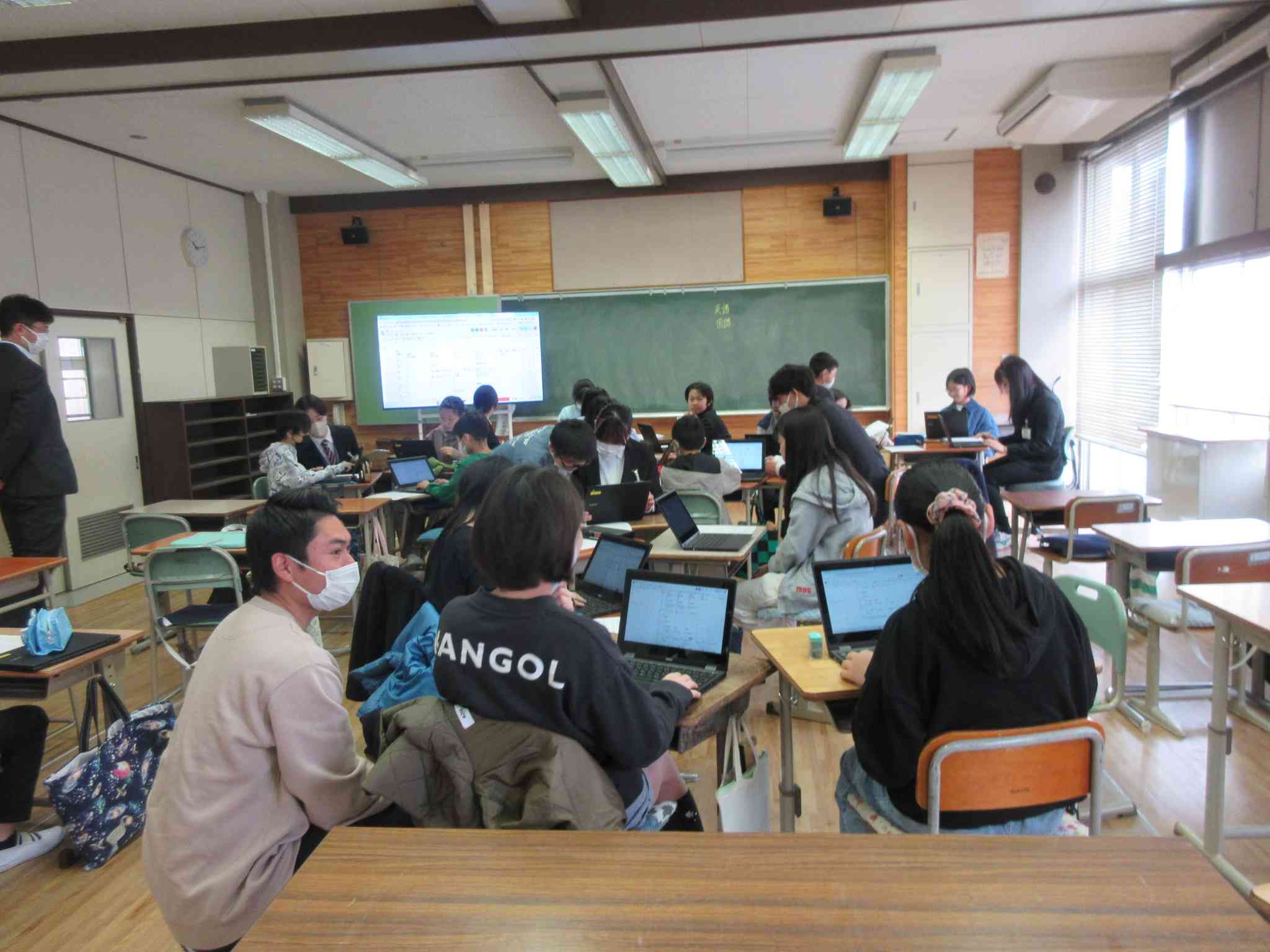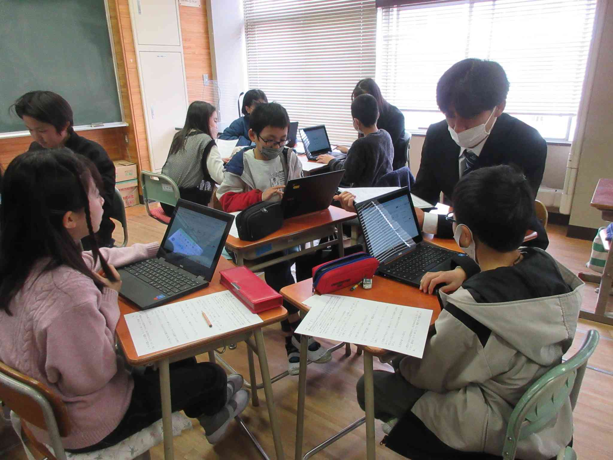 5年生のICTを活用した学習を 7つの大学から10人の大学生が見に来ました。 英語の発音練習のアプリの活用や情報モラルについて、 また、算数の正多角形のプログラミングを参観しました。 大学生のからは、 「小学生がタブレットを使いこなしていることに驚いた」 という感想が多く聞かれました。