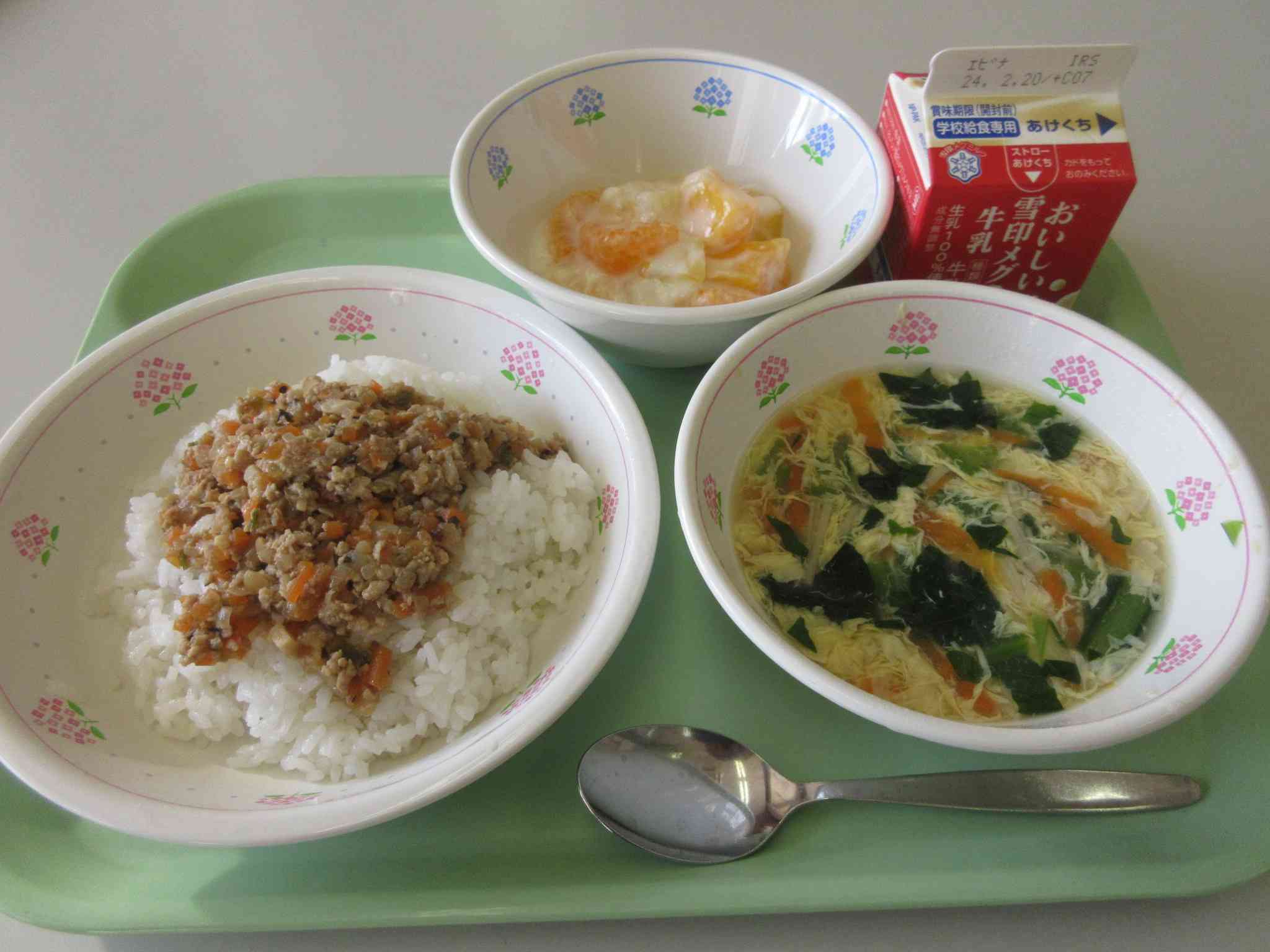 今日のこんだては、ガパオライス、卵と小松菜のスープ、ヨーグルトポンチ、牛乳です。 卵は相模原市内産、豚肉と小松菜は神奈川県内産です。 ガパオライスは、タイの料理で、日本語でいうとバジル炒めごはんです。バジルとは、シソ科のハーブで世界中で使われています。タイではナンプラーという魚から作られる醤油のような調味料を使います。給食ではナンプラーの代わりにオイスターソースやしょうゆ、バジルと豚ひき肉、玉ねぎ、人参、エリンギなど野菜もたっぷり入れて作りました。 エリンギは、体の調子を整えるみどりのなかまの食べ物です。【添付ファイル】