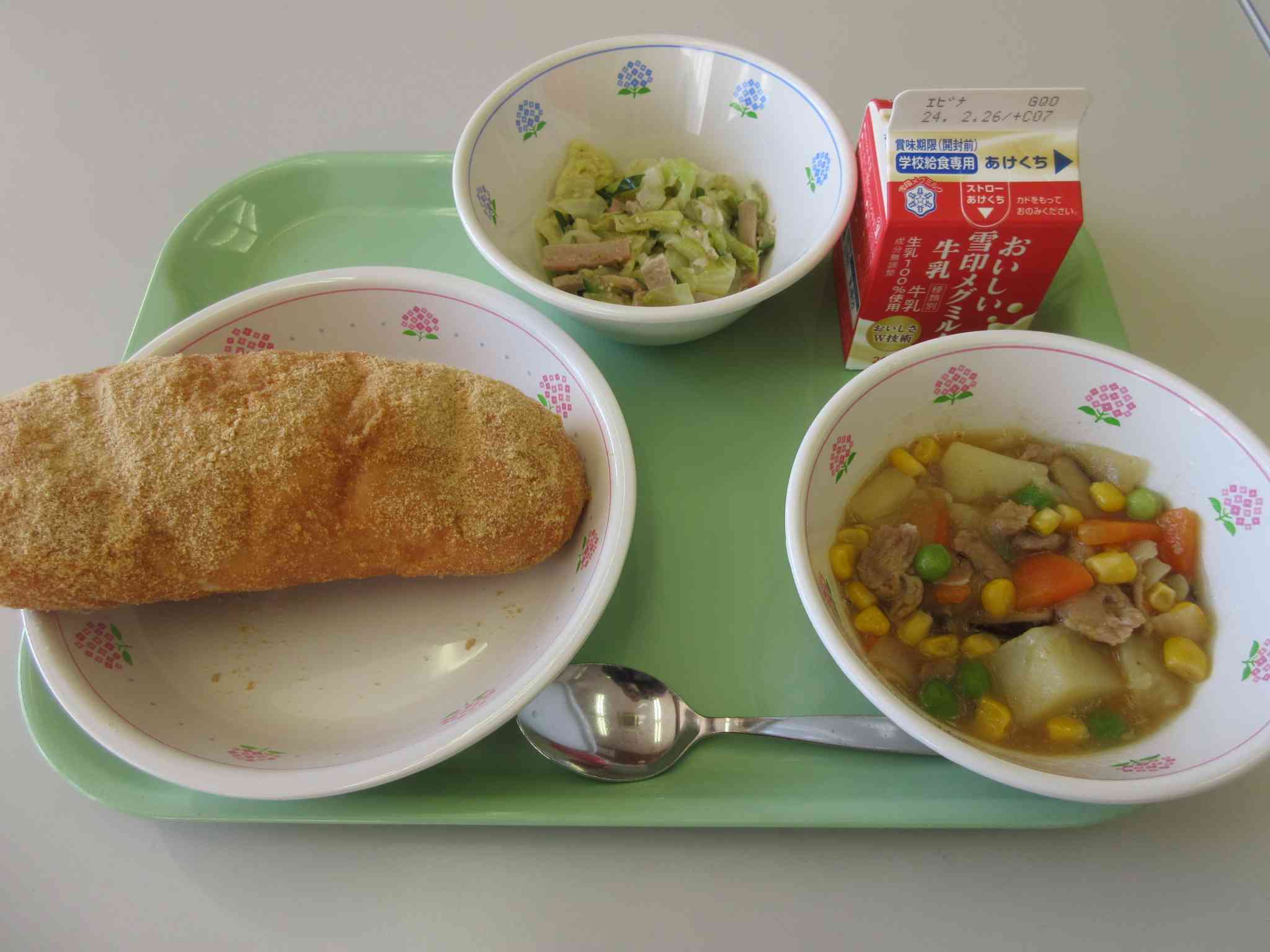 今日のこんだては、きなこ揚げパン、コーンと豚肉の炒め煮、ごまドレッシングサラダ、牛乳です。 豚肉とキャベツは神奈川県内産です。 揚げパンは、昔、固くて大きなコッペパンをおいしく食べられるようにと考えて作られたようです。パン屋さんから届いたコッペパンを給食室のきれいな米油でカリッと揚げて、きなこと砂糖を合わせたものをまぶして出来上がりです。きなこは大豆を炒って砕いて粉にしたものです。 きなこは、体をつくる赤のなかまの食べ物です。【添付ファイル】