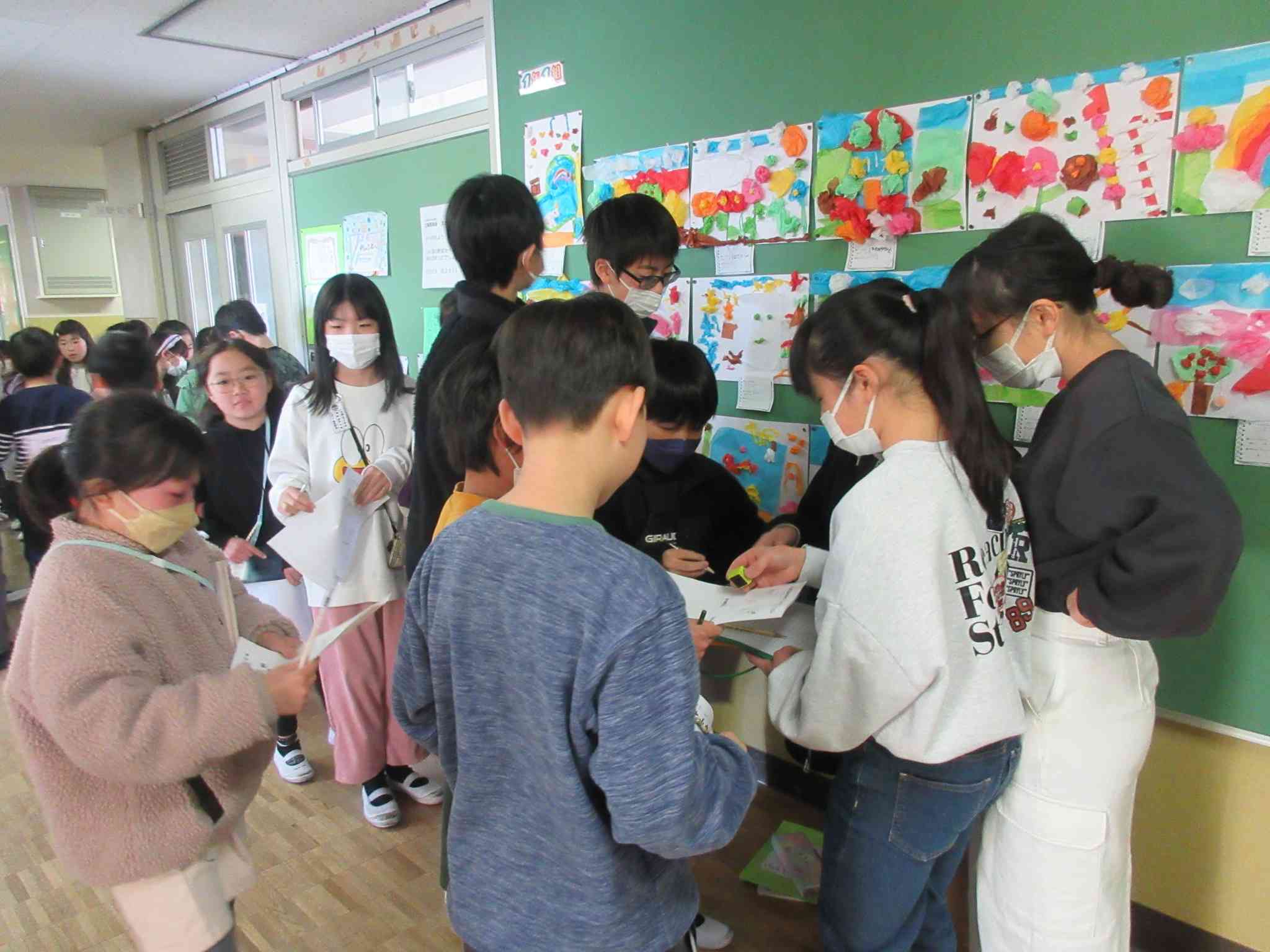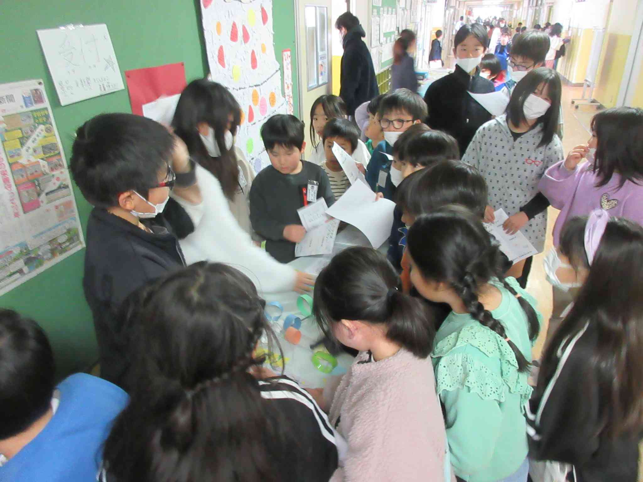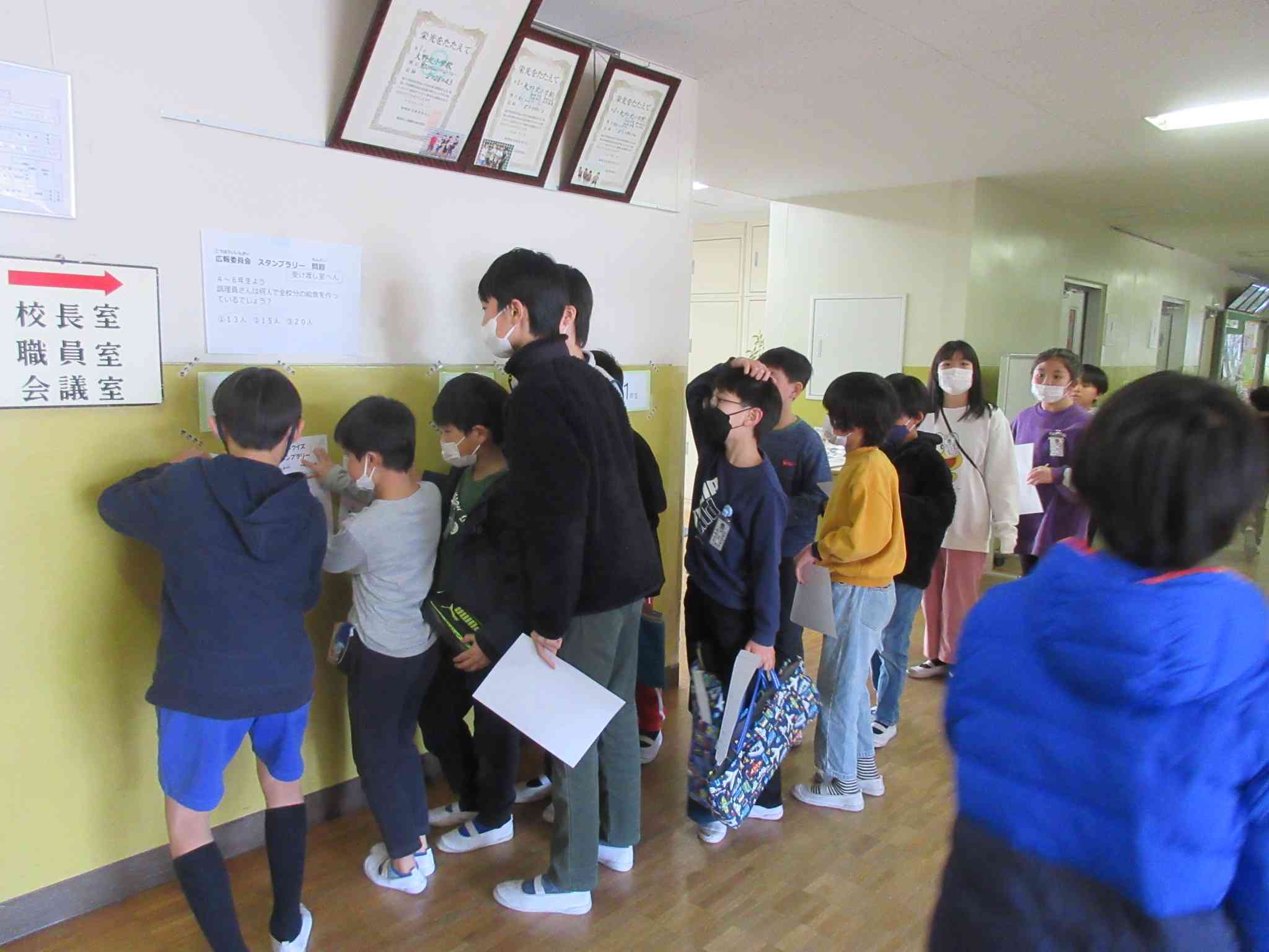 5年の広報委員さんが休み時間にスタンプラリーを企画しました。 ランチルームだった今の1年1組教室の工事がいつから始まったか、給食調理員さんは何人かなど、 みんなに大野北小のことをもっと知ってもらおうとクイズを考えました。 参加者多数、大盛況でした。