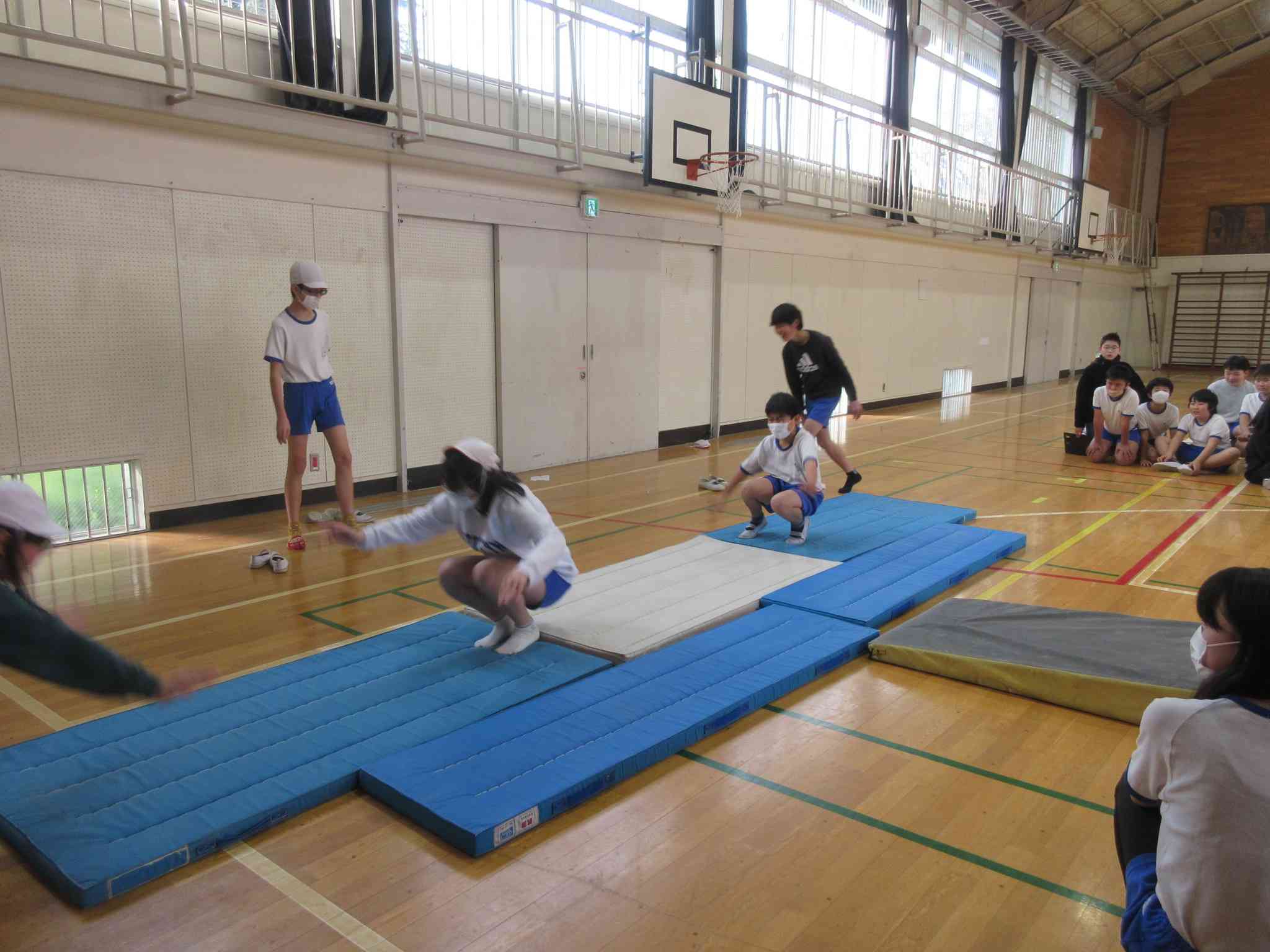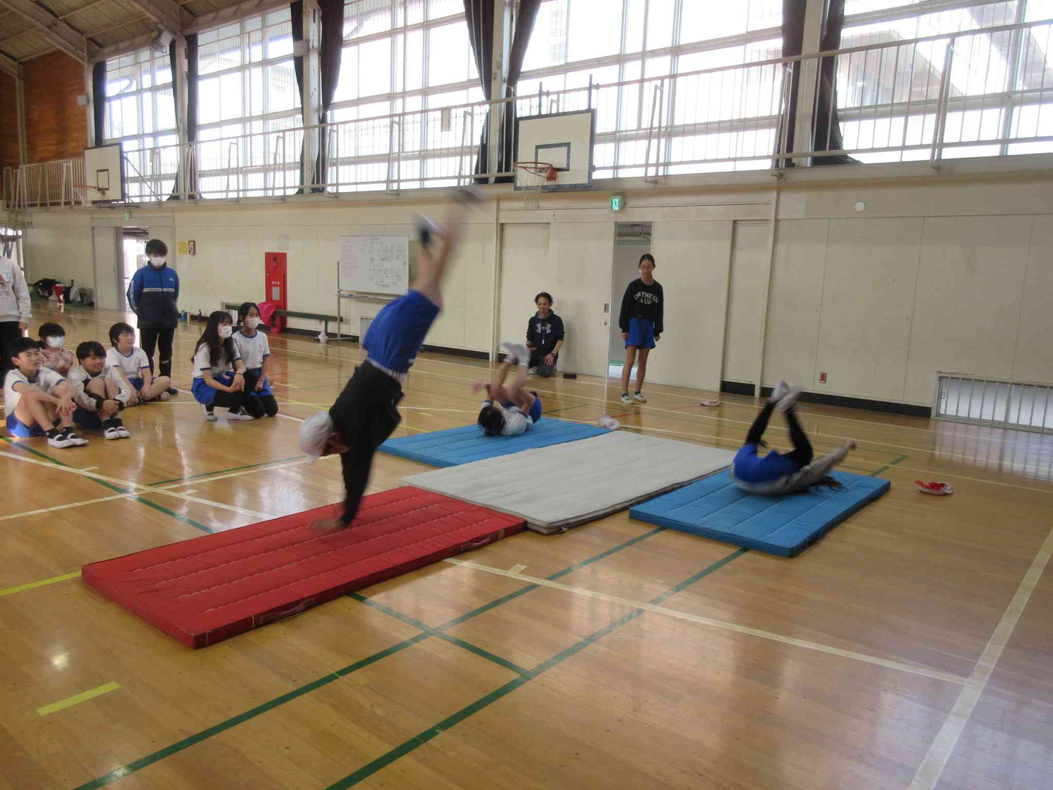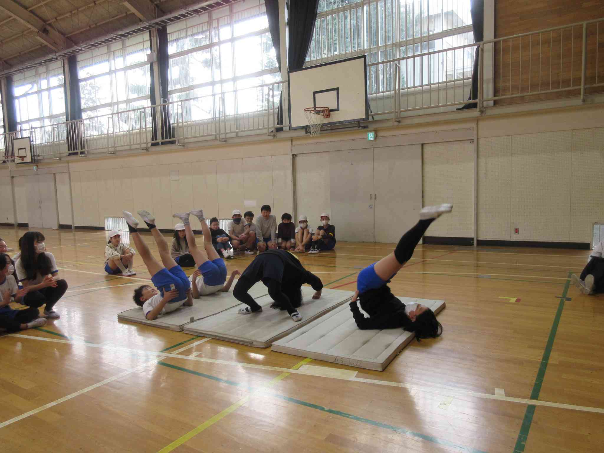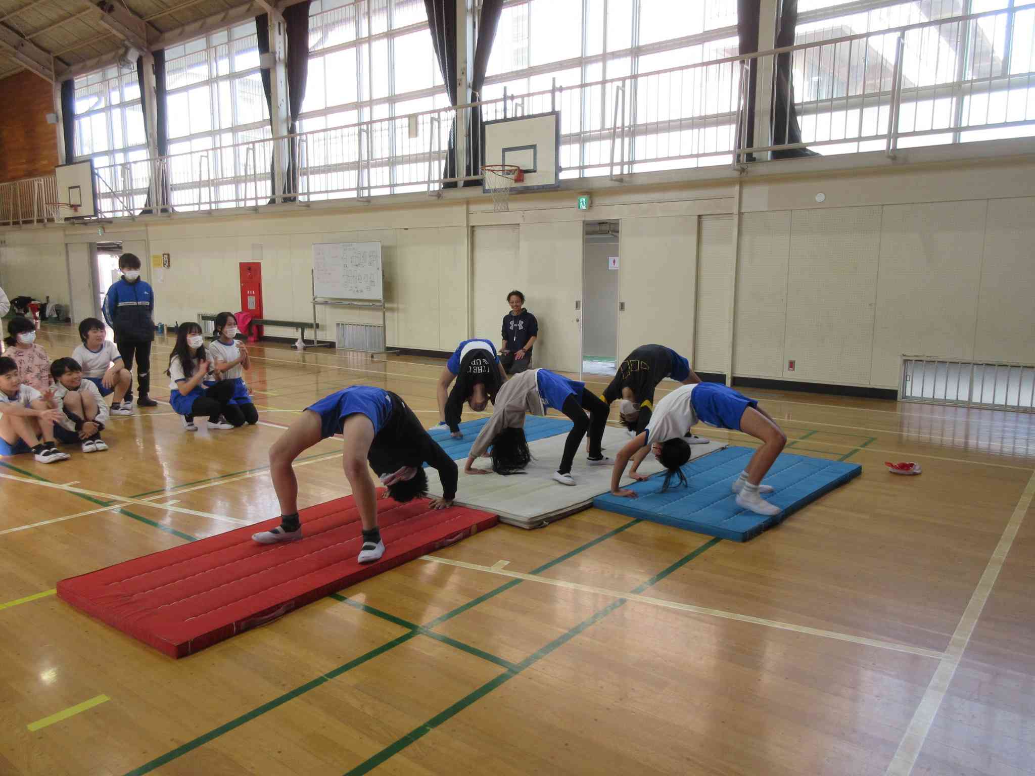 マット運動の締めくくりに、 集団演技の発表会をしました。 それぞれができる技を組み合わせると・・ みんなから「ウオーーー」という歓声があがりました。 協力する力って素晴らしいですね。