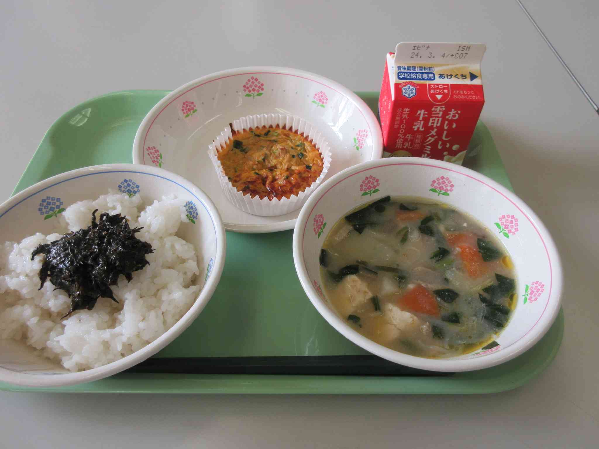 今日のこんだては、ごはん、切り干し大根の卵焼き、豚汁、のりの佃煮、牛乳です。 卵は相模原市内産、豚肉は神奈川県内産です。 切り干し大根は、冬のおいしい大根を冷たい風にあてながら干して、乾燥させた保存食です。切り干し大根は、生の大根より甘みがあって、カルシウムなどの栄養素も多くなります。今日は切り干し大根をちりめんじゃこと玉ねぎ、しょうが、万能ねぎで卵焼きにしました。 切り干し大根は、体の調子を整えるみどりのなかまの食べ物です。【添付ファイル】