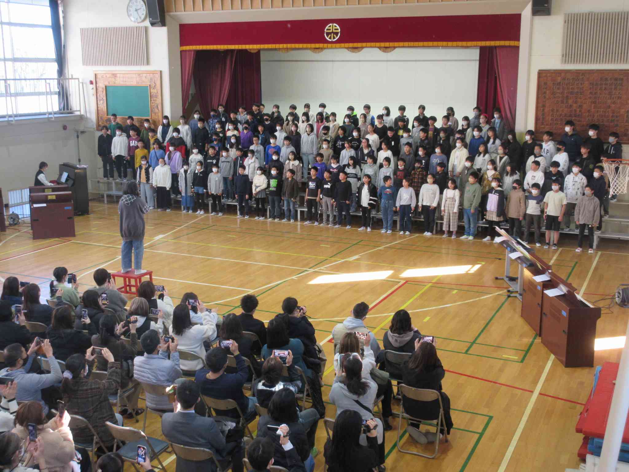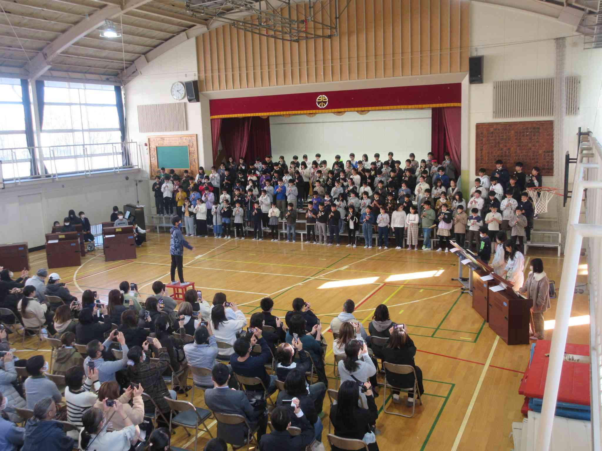 13日、6年生は小学校生活最後の授業参観でした。 前半、それぞれの教室で授業をしたあと、 後半は体育館で音楽の発表をしました。 「木星」をリコーダーとキーボードで合奏し、 「ふるさと」をしっとり歌い上げました。