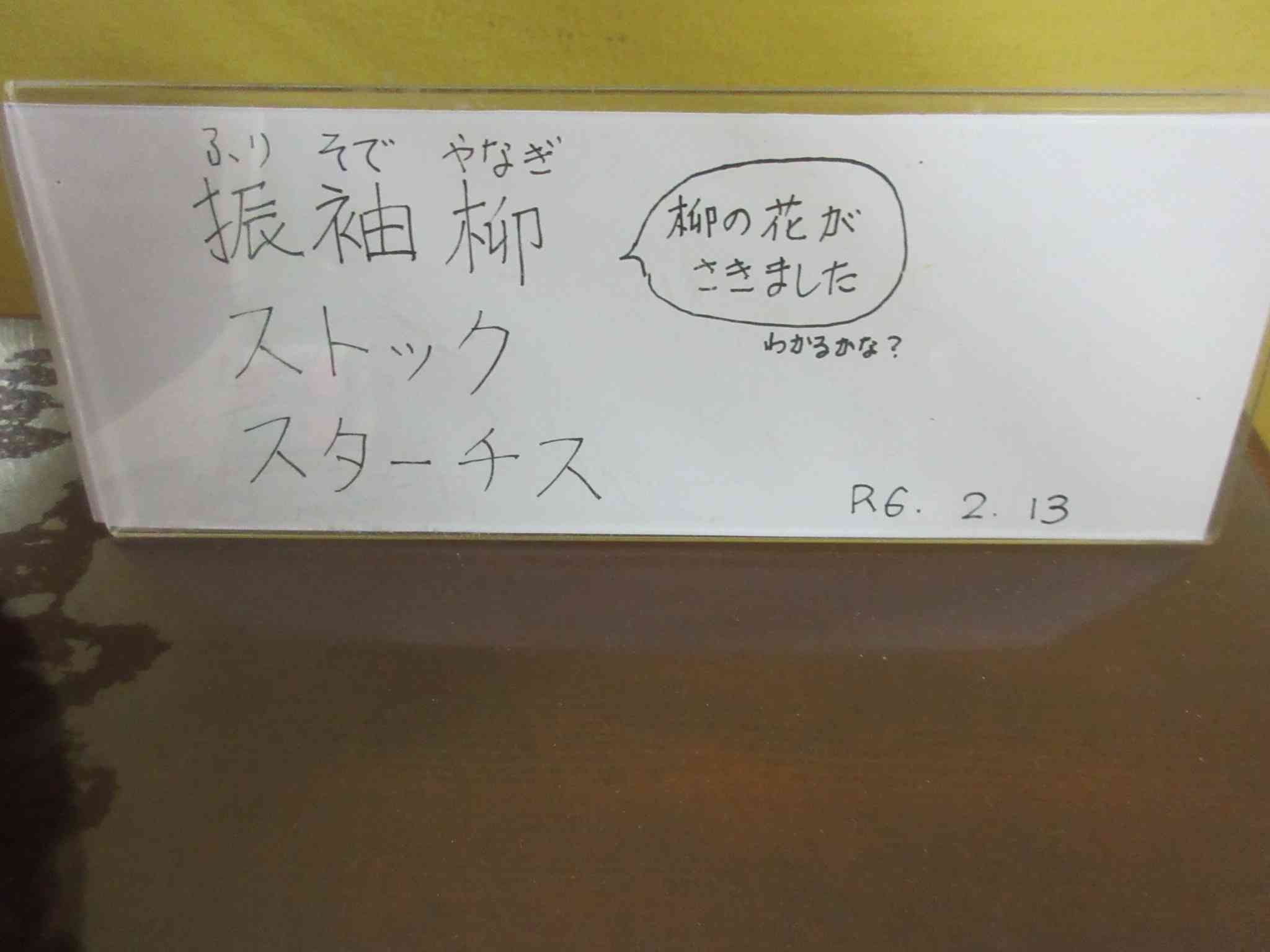 2月13日のお花は、 振袖柳、ストック、スターチスです。 メッセージカードを見てください。 「柳の花がさきました」とあります。 さて、どれでしょうか?