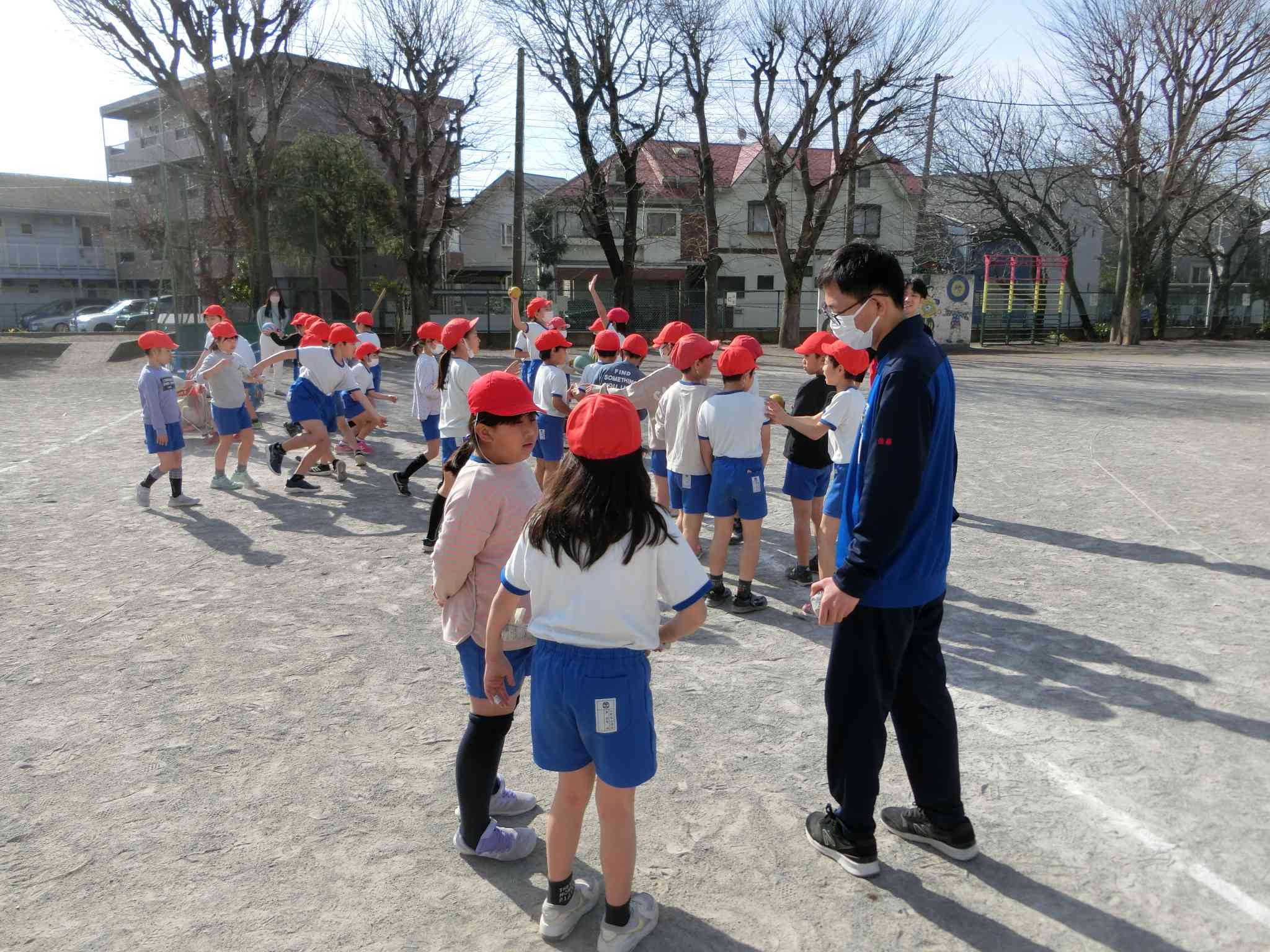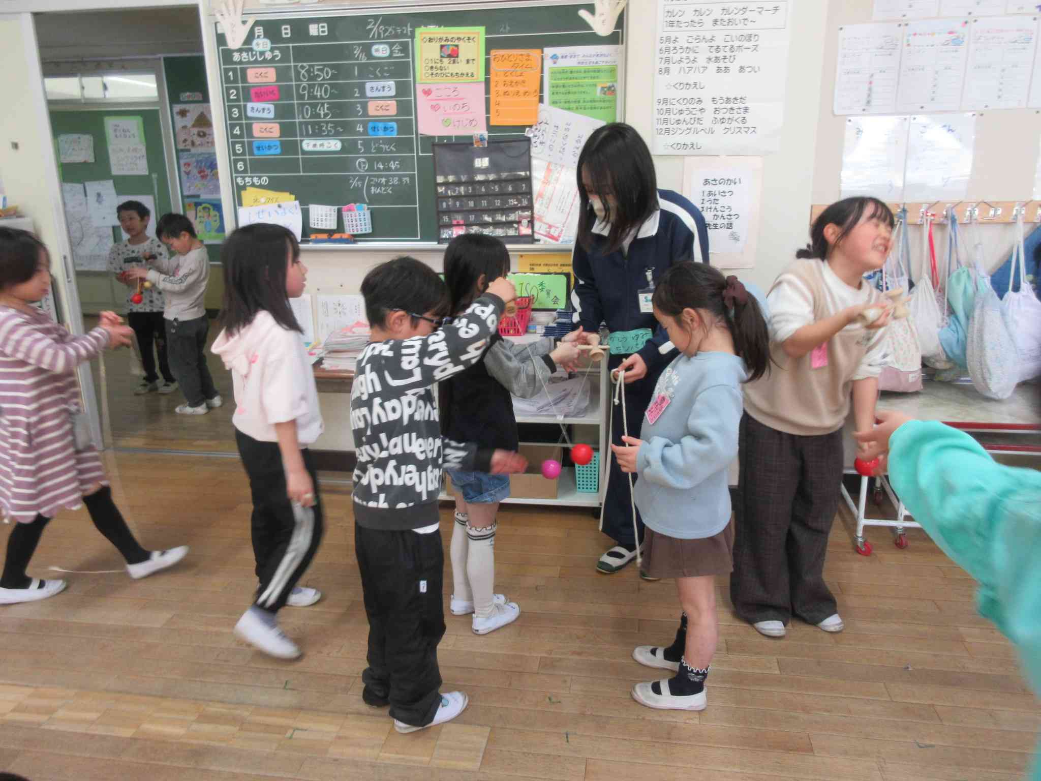 4名の高校生が、 北小の3年生と1年生と一緒に勉強をしてくれました。 体育で体を動かしたり、こまの回し方を教えてもらったり、 最初は緊張していた子どもたちも、 とっても仲良くなりました。