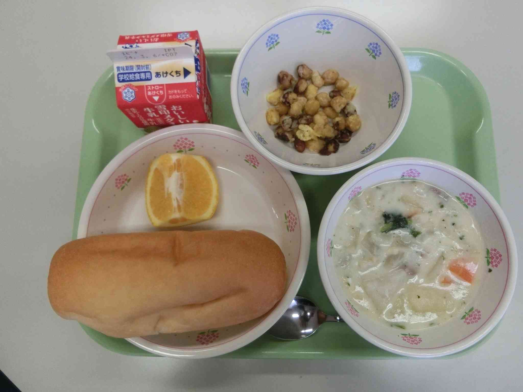 今日のこんだては、米粉パン、たらとかぶのシチュー、スパイシーミックスビーンズ、はっさく、牛乳です。 スパイシーミックスビーンズには、大豆、金時豆、ひよこ豆の3種類の豆が入っています。大豆は「畑の肉」ともいわれるほど、みんなの体をつくるたんぱく質やカルシウムがたくさん含まれています。金時豆は赤いんげん豆のなかまで、ひよこ豆はガルパンゾーtもいわれます。スパイシーに味付けしたので、豆が苦手な人もぜひ食べてみてください。 大豆は、体をつくる赤のなかまの食べ物です。【添付ファイル】