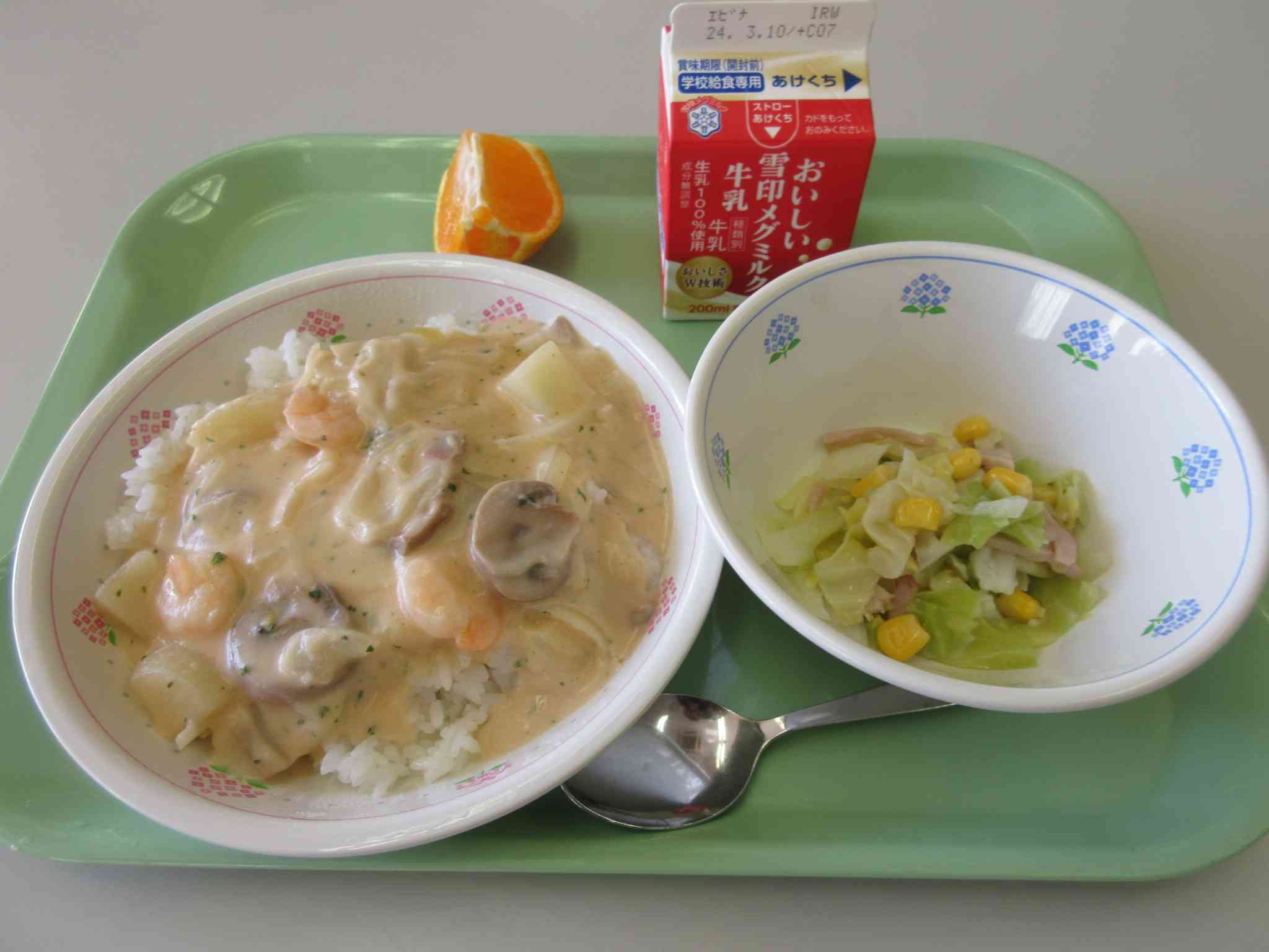 今日のこんだては、バターライス、えびのオーロラソース、コールスローサラダ、牛乳です。 キャベツは神奈川県内産です。 デコポンは、2月から4月においしい果物で、清見とポンカンをかけあわせたみかんです。頭にボコッとしたこぶのような出っ張りがあります。不知火という果物の中で糖度13度以上の甘みがあるものをデコポンと呼ぶそうです。体を元気にしてくれるビタミンCたっぷりの甘くておいしいデコポンです。 デコポンは、体の調子を整えるみどりのなかまの食べ物です。【添付ファイル】