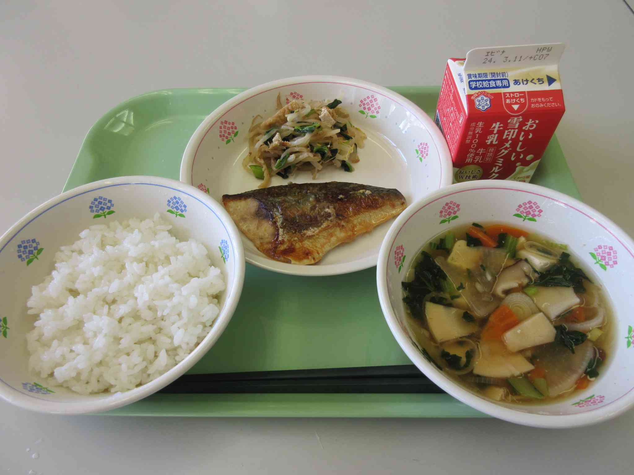今日のこんだては、ごはん、さばのゆずみそ焼き、もやしのおかかあえ、吉野汁、牛乳です。 ゆずは、相模原市藤野産のゆず果汁を使いました。キャベツと小松菜は神奈川県内産です。 吉野汁は、奈良県の吉野地方がくずの産地であることから、葛粉でとろみをつけた汁物のことを吉野汁と呼ぶようになったそうです。葛粉はとても高いので、じゃがいもでんぷんを代わりに使ってとろみをつけました。とろみがついて、冷めにくく、具にも味がからまりやすいので寒い時期にはぴったりの汁物です。 でんぷんは、熱や力のもとになるきいろのなかまの食べ物です。【添付ファイル】