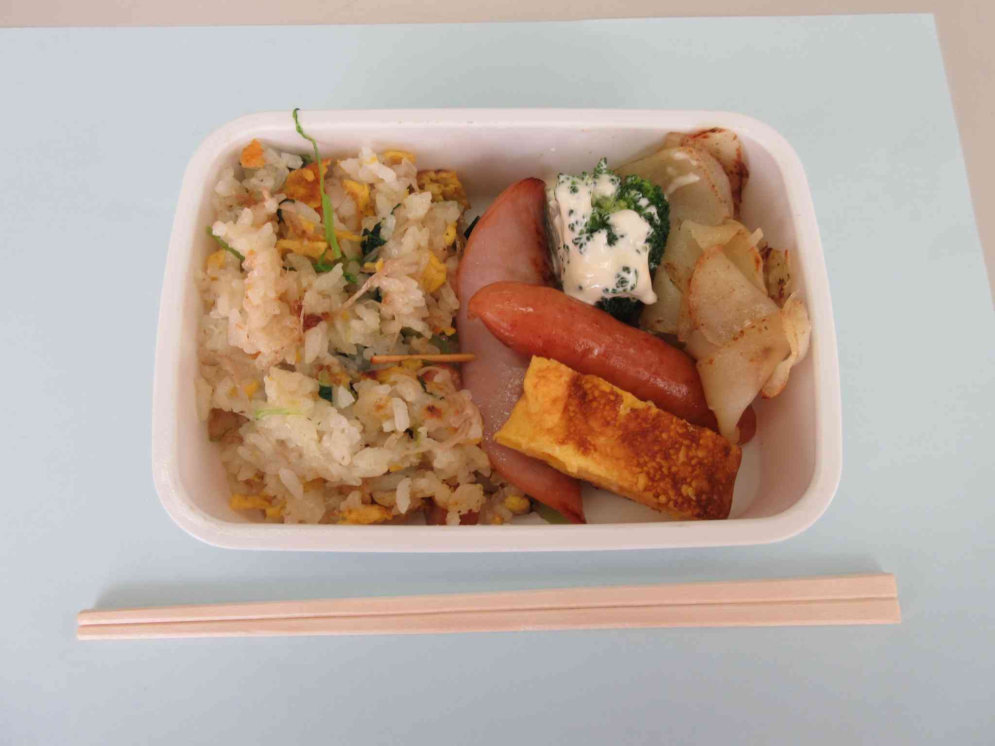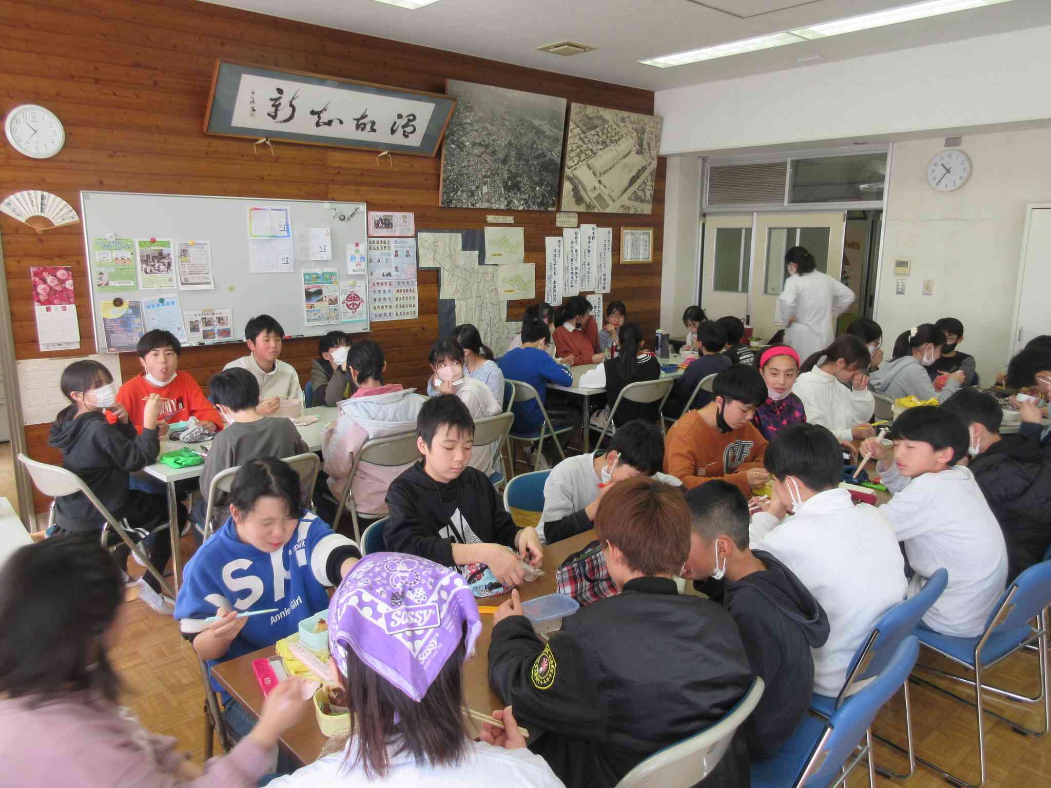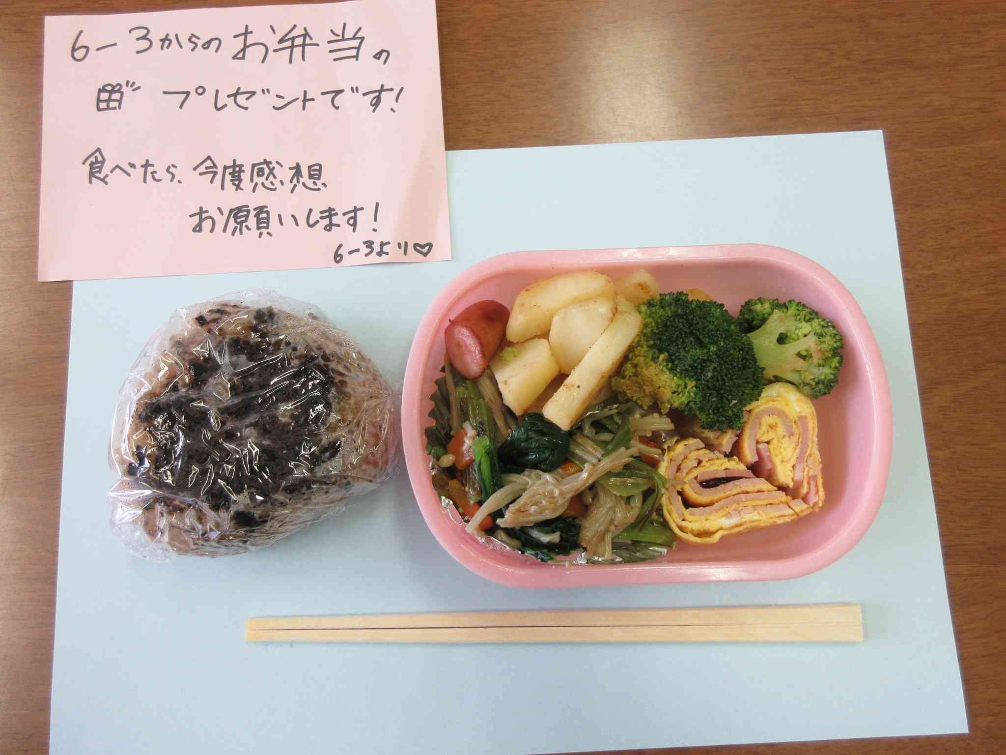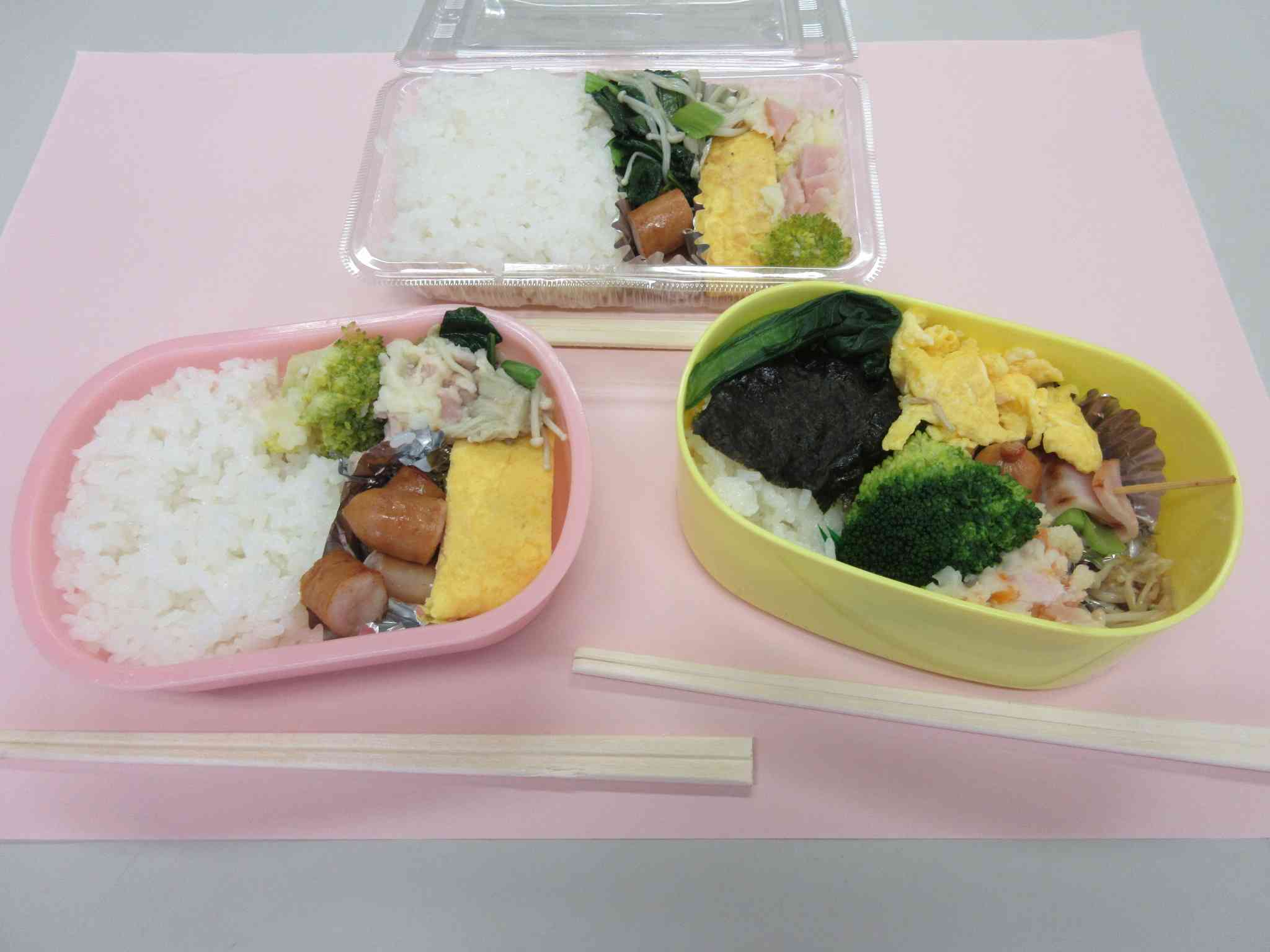 6年生の最後の調理実習はお弁当つくりでした。 材料は、米、たまご、ウインナー、小松菜、ハム、 えのきだけ、ブロッコリー、じゃがいもです。 グループごとにつくったお弁当は千差万別でした。