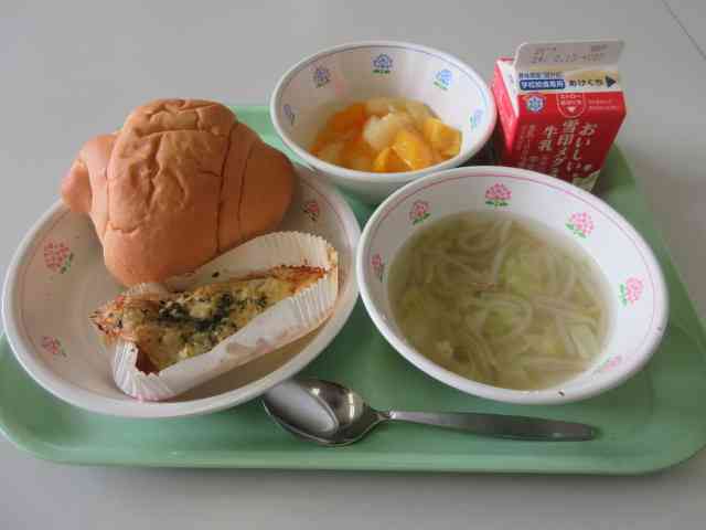 今日のこんだては、ロールパン、ホキのチーズ焼き、もやしとキャベツのスープ、フルーツあえ、牛乳です。 キャベツは、神奈川県内産です。 もやしとキャベツのスープには、鶏肉ともやし、キャベツ、春雨、にんにく、しょうが、長ねぎ、パセリ、アーモンドが入っています。フルーツあえには、みかん缶とパイン缶、黄桃缶とりんごジュースが入っています。給食には何の食べ物が使われているか、食べ物の名前、味も確かめながらよくかんで楽しく食べてください。 りんごは、体の調子を整えるみどりのなかまの食べ物です。【添付ファイル】