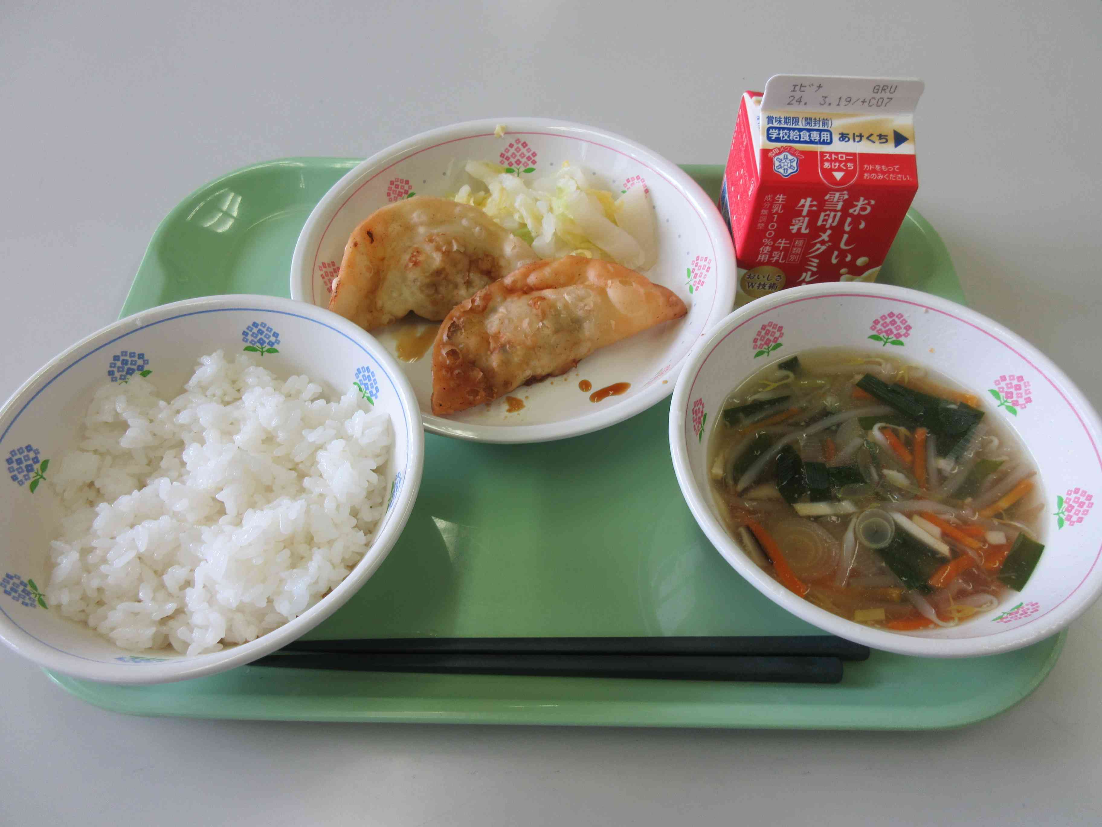 今日のこんだては、ごはん、揚げぎょうざ、ゆで白菜、もやしスープ、牛乳です。 豚肉とキャベツは神奈川県内産です。 にらがおいしい季節は3〜5月の春です。もやしスープにも揚げぎょうざにもにらが入っています。 揚げぎょうざは給食室の手作りです。豚ひき肉ににら、キャベツ、長ねぎ、にんにく、しょうがを細かく切ったものを合わせて具を作り、小麦粉の皮で包んで、油で揚げました。1920個のぎょうざをを調理員さんが作ってくれました。 にらは、体の調子を整えるみどりのなかまの食べ物です。【添付ファイル】
