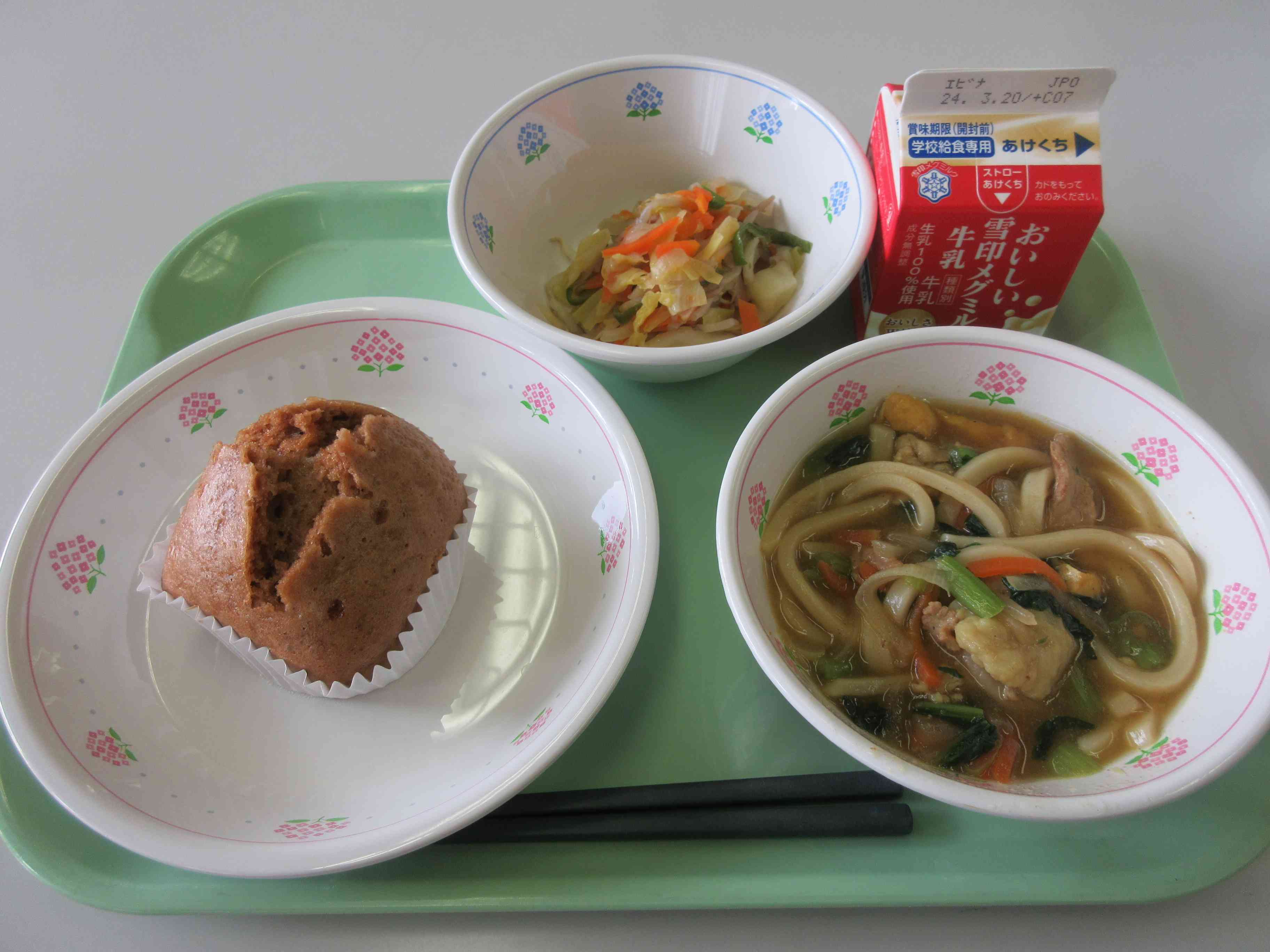 今日のこんだては、カレー南蛮うどん、野菜炒め、黒糖蒸しパン、牛乳です。 豚肉とキャベツは神奈川県内産、卵は相模原市内産です。 カレー南蛮は日本で生まれた料理で、おそばやさんが日本のうどんとインドのカレーのよいところを合わせて作りました。普通のカレーと違って油揚げや長ねぎが入っていたり、和風のだしやしょうゆを使っていたりするところがカレー南蛮うどんの特徴です。 うどんは、熱や力のもとになるきいろのなかまの食べ物です。