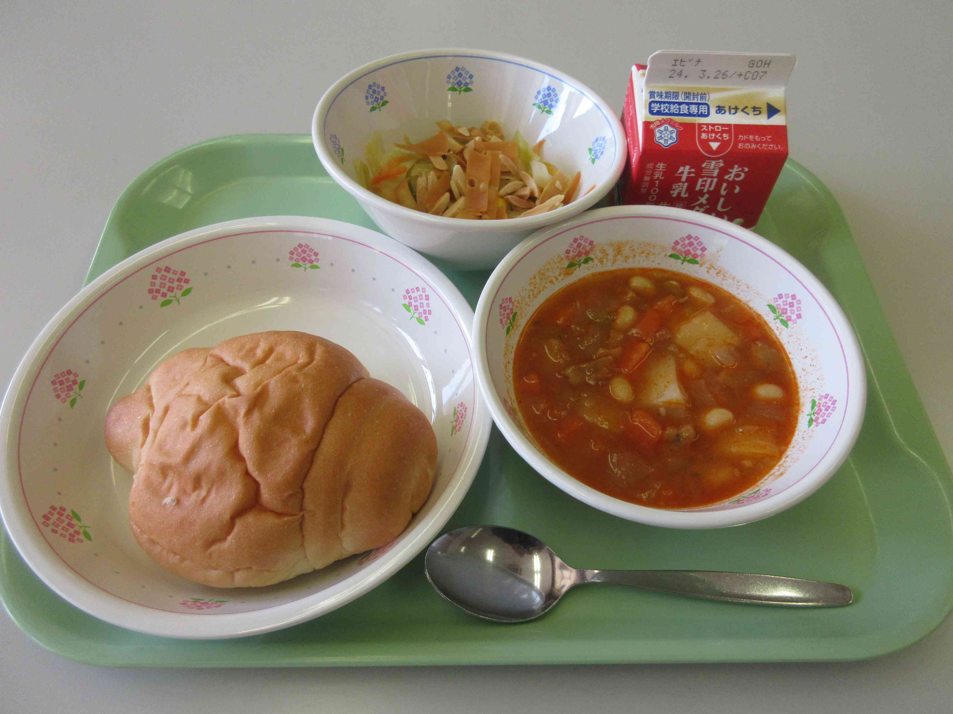 今日のこんだては、ロールパン、ポークビーンズ、アーモンドのパリパリサラダ、牛乳です。 アーモンドのパリパリサラダには、キャベツととうもろこし、にんじん、アーモンドが入っています。そしてアーモンドと一緒に入っているパリパリの細長いものは、ワンタンの皮を細く切って米油で揚げたものです。ワンタンの皮は小麦粉からできています。よくかんでアーモンドの食感と味も楽しんで食べてください。 ワンタンの皮は、熱や力のもとになるきいろのなかまの食べ物です。【添付ファイル】