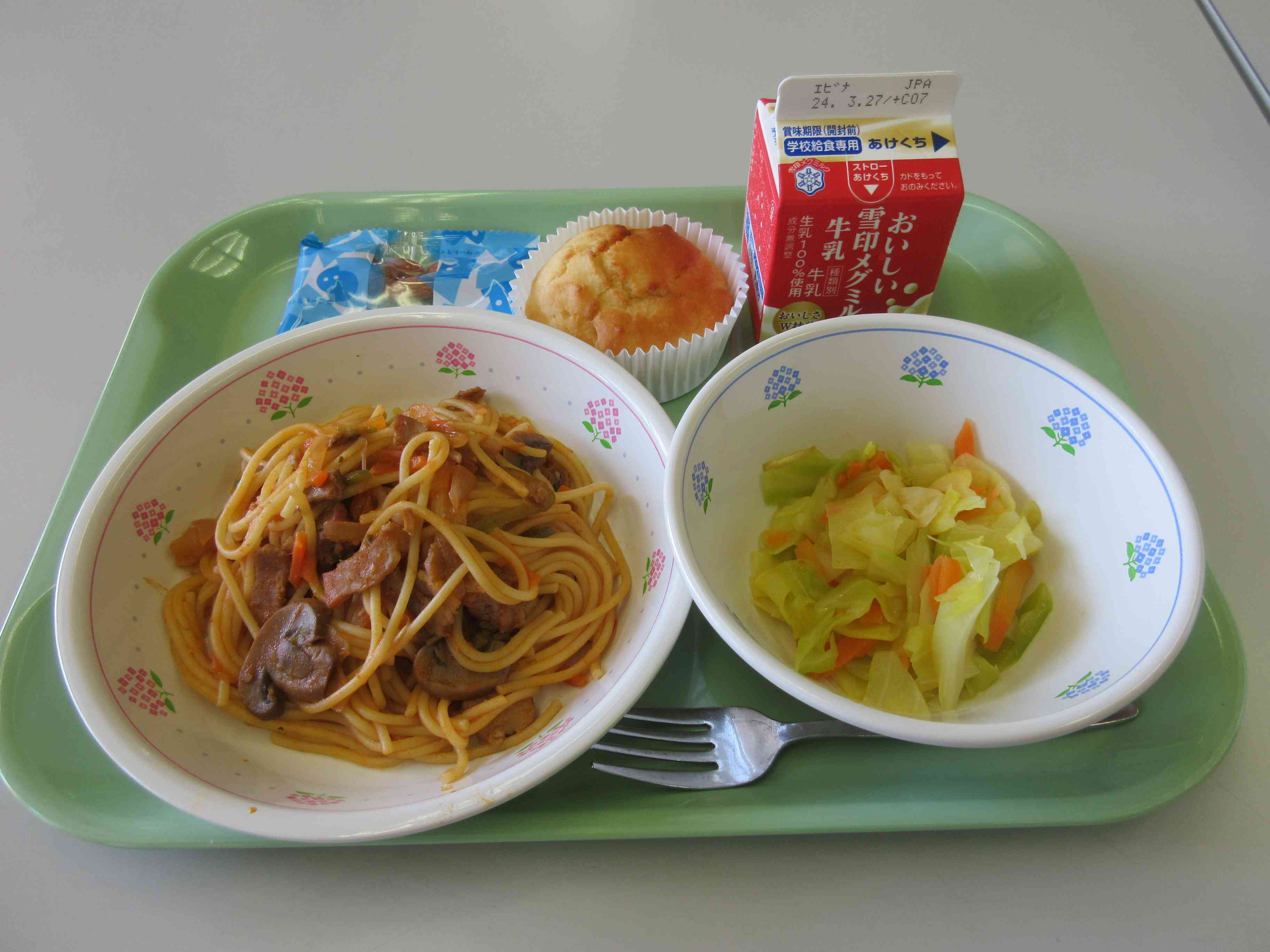 今日のこんだては、スパゲティナポリタン、キャベツのソテー、ヨーグルトケーキ、アーモンド、牛乳です。 豚肉は神奈川県内産です。 ヨーグルトは牛乳からできていて、牛乳を乳酸菌で発酵させると、すっぱさのあるヨーグルトになります。ヨーグルトの乳酸菌は、お腹の調子を整えてくれたり、かぜをひきにくくしてくれたり、体にとてもよい働きがあります。ヨーグルトには体をつくるたんぱく質やカルシウムがたくさん含まれています。 ヨーグルトは、体をつくるもとになる赤のなかまの食べ物です。【添付ファイル】