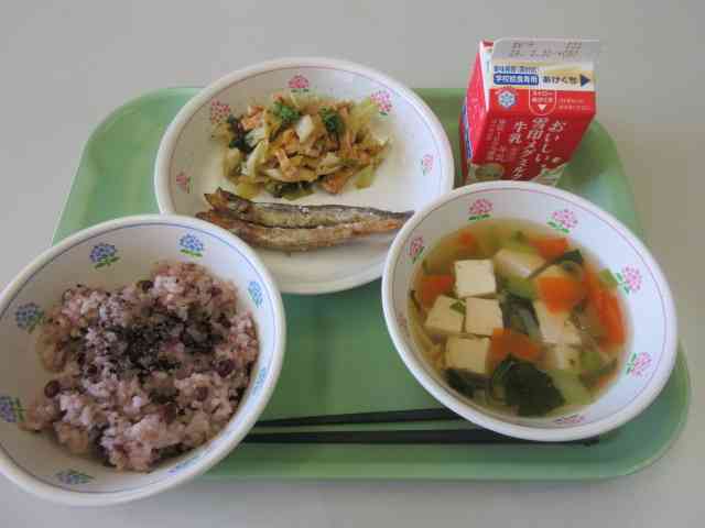 今日のこんだては、赤飯、ししゃもの唐揚げ、すまし汁、菜の花の煮浸し、牛乳です。 小松菜は神奈川県内産です。 菜の花の煮浸しには、なばなとキャベツ、油揚げ、花かつおが入っています。春の訪れを知らせてくれる野菜、なばなは菜の花や花菜とも呼ばれるアブラナ科の野菜です。少しほろ苦さがありますが、それが春の野菜の特徴で、ゆでると甘みが出て美味しくなります。なばなには、皮ふや粘膜を丈夫にして風邪などを防いでくれるビタミンがたくさん含まれています。 なばなは、体の調子を整えるみどりのなかまの食べ物です。【添付ファイル】