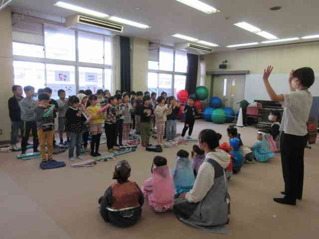はらから保育園の年長組の子どもたちが、 1年生に「アリババととうぞく」のオペレッタを 出張講演してくれました。 素敵な踊りや歌を堂々と演じていました。 1年生からも鍵盤ハーモニカの演奏をプレゼントしました。