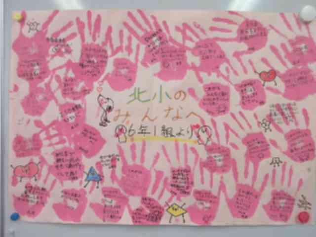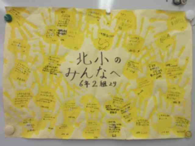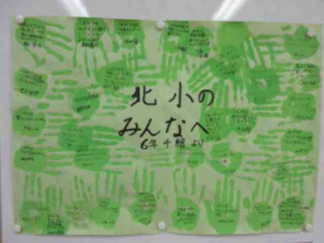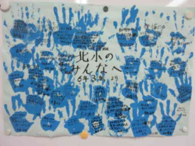 卒業生の6年生が、在校生に向けて、 手形のメッセージを残してくれました。 1階校長室前のろうかにはってありますので、 22日にぜひ読んでくださいね。