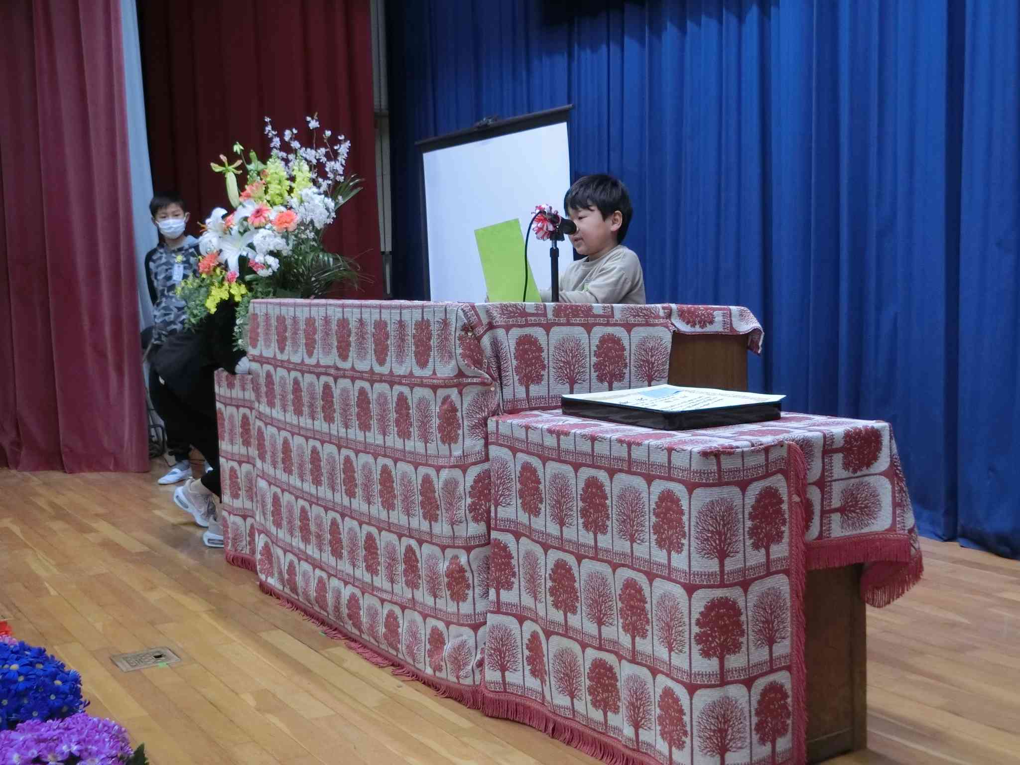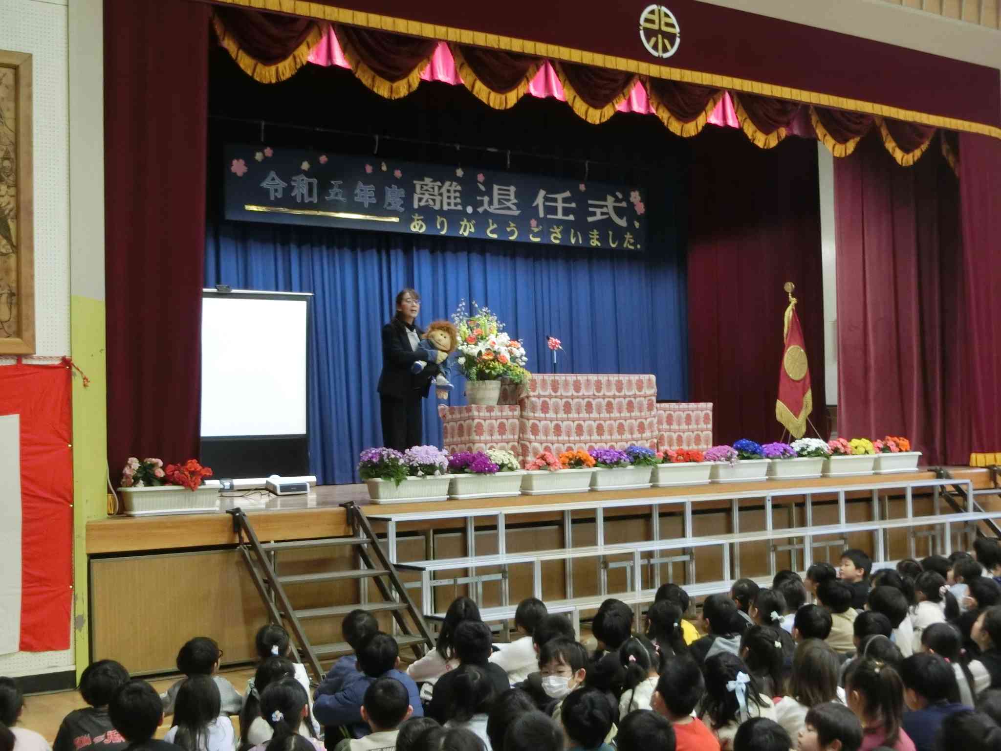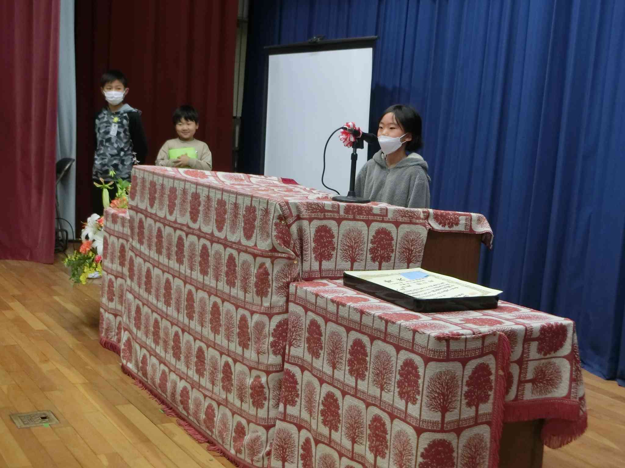 令和5年度の修了式を行いました。 6年生のいない体育館は少し寂しいものですが、1~5年生が体育館に全員集まって儀式を行うことができました。 1・3・5年生の代表児童が今年度の振り返りやこれからの目標を発表しました。