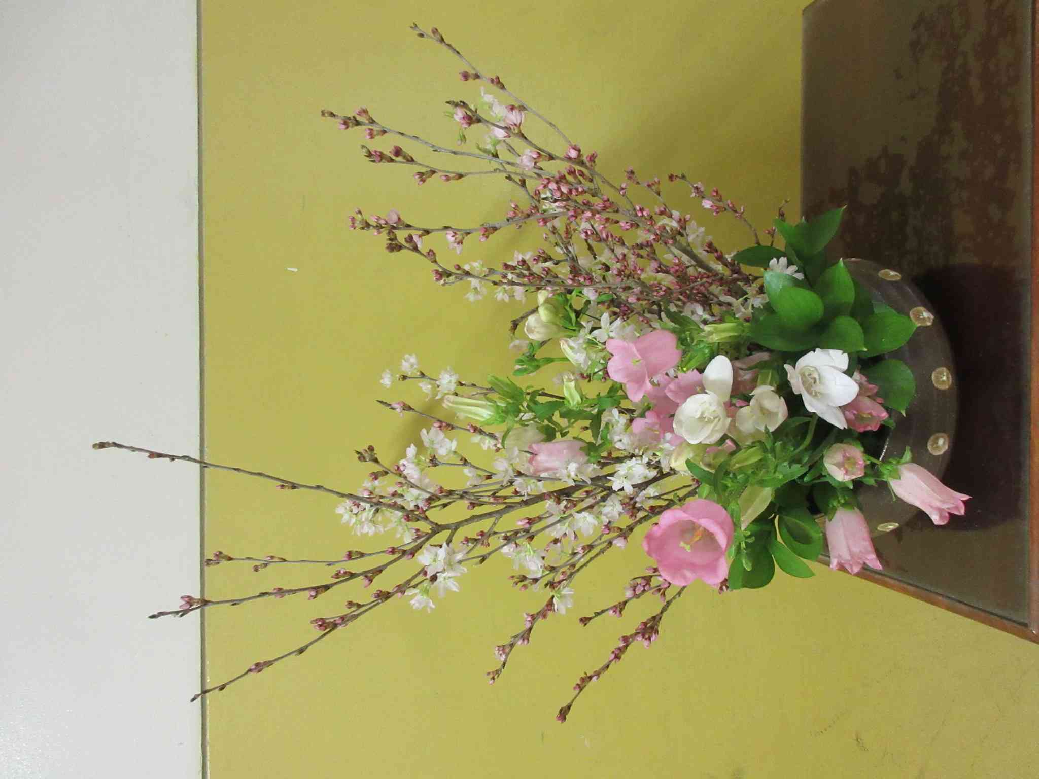 今年度も始業式前の4月5日に、 安藤さんがお花を生けてくださいました。 桜を2種類、 手前のまだつぼみの色の濃い桜が彼岸桜、 奥の色の薄い花が咲いているのが啓翁(けいおう)桜。 あとは、カンパニュラ、フリージア、ルスカス(葉)です。 4月8日には、つぼみだった彼岸桜も一斉に咲きました。 春爛漫といった風情です。 来校の際は、ぜひご覧ください。