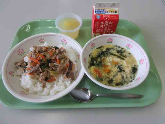 今日の献立は、ビビンバ、わかめと卵のスープ、りんごゼリー、牛乳です。 卵は相模原市内産です。 ビビンバは韓国料理の一つで、韓国風の混ぜご飯です。「ビビン」は混ぜる、「バ」は「ごはん」という意味があります。豚肉にしょうが、にんにく、しいたけ、にんじん、小松菜、もやしと野菜たっぷりで、お肉といっしょに食べられて、ごはんが進みます。りんごゼリーは青森県内産のりんごダイスとりんごジュースを使って、給食室で手作りしました。 りんごは、体の調子を整えるみどりのなかまの食べ物です。【添付ファイル】
