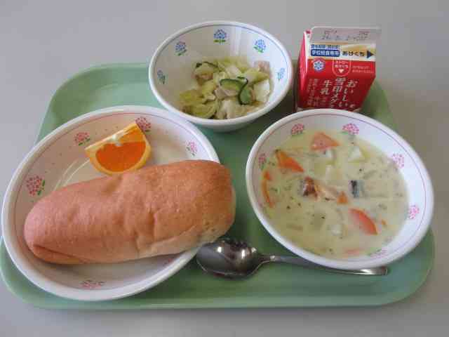 今日の献立は、米粉パン、鮭のクリーム煮、フレンチサラダ、清見オレンジ、牛乳です。 毎月19日は食育の日です。いつもの食生活、食べ方を見直して、できることから始めてみましょう。食事のあいさつはきちんとできていますね。パンは一口ずつちぎって食べていますか。よくかんでゆっくり味わって食べていますか。食器や牛乳パックの片付け方はどうでしょう。みんなで楽しく給食を食べて、片付けも協力して行いましょう。 米粉パンは、熱や力のもとになるきいろのなかまの食べ物です。【添付ファイル】