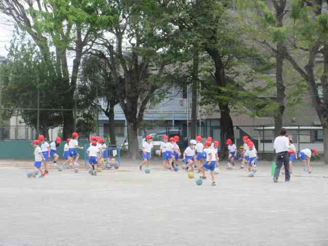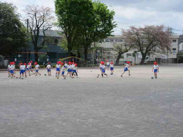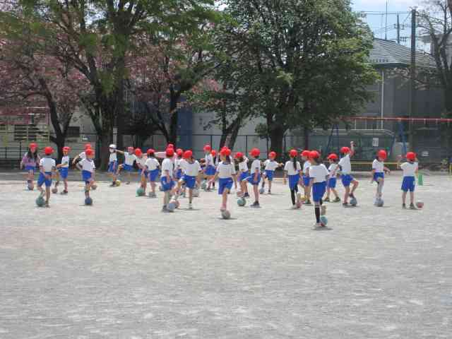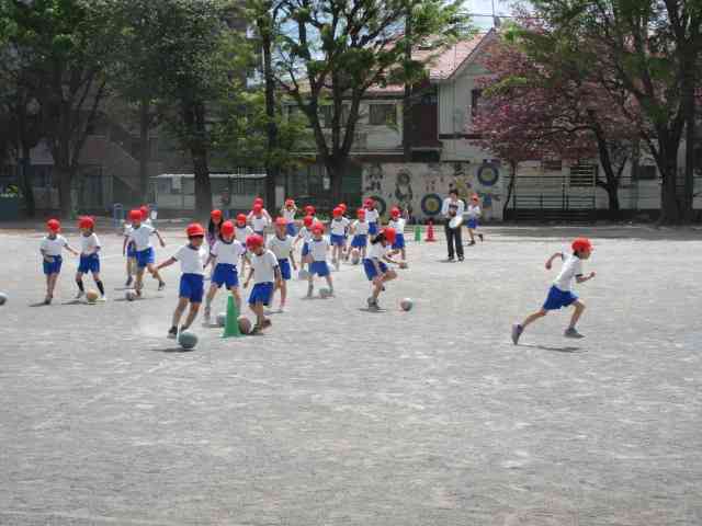 2年生の体育は、ボールけりあそびからスタートしました。 ボールと足がなかよしになるように、 ボールに左右の足を交互にトントンしたり、 止めたり、ドリブルをしたりしました。