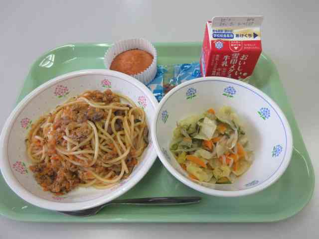 今日の献立は、スパゲティミートソース、野菜炒め、米粉マドレーヌ、アーモンド、牛乳です。 卵は相模原市内の小川さんの卵です。 米粉マドレーヌは給食室の手作りです。パンやスパゲティ、ケーキを作るときは小麦粉をよく使いますが、今日はお米の粉、米粉を使いました。 37kgのスパゲティと、豚肉や野菜などをよく煮込んだミートソースを合わせたスパゲティミートソースもたくさん食べてください。 スパゲティは、熱や力のもとになるきいろのなかまの食べ物です。【添付ファイル】