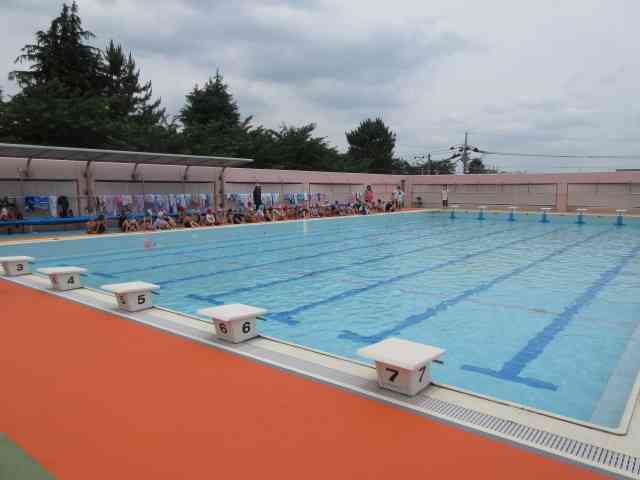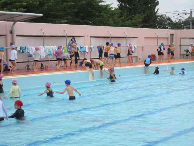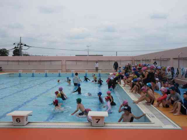 昨年は密を避けるために、 学年を2つに分けてプールに入りましたが、 今年は2年生全員で入りました。 プールサイドで約束を聞き、水慣れからです。