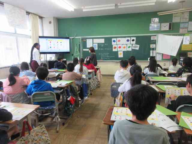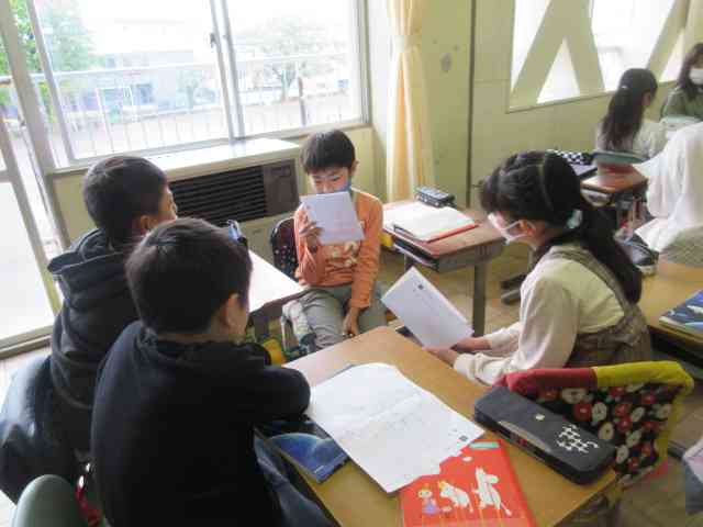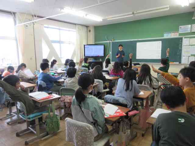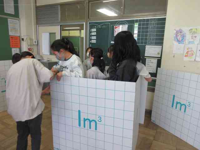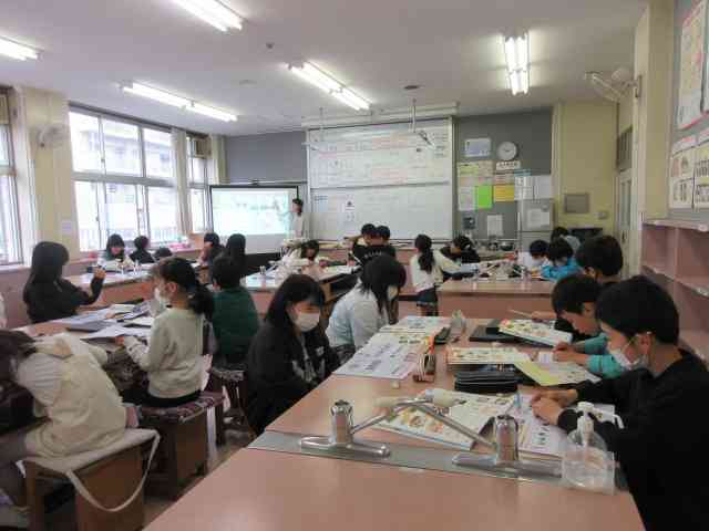 5年生の教室では、 国語で登場人物の行動について考えていました。 算数のように答えが1つではないから、 「間違えはない」と考えを共有していました。 算数では、1立方メートルの箱を組み立てて体感していました。 実感を伴う学習は身につきます! 英語の学習では、英単語の発音を自然とみんなで繰り返し発声していました。 英語を聞く耳が育っています。 家庭科は、コンロの使い方の学習です。 実習も間近にあります。