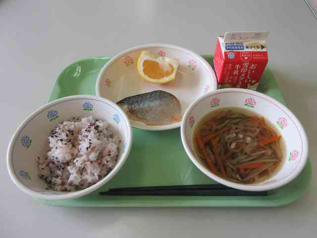 今日の献立は、古代米ごはん、さばの塩焼き、沢煮椀、美生柑、牛乳です。 古代米とは、米づくりが始まったころから作られていたお米のことで、古代(遠い昔)から作れていたので古代米と呼ばれています。古代米の中でも赤米や紫黒米、香り米はいまでも栽培されています。今日の給食では赤米を使いました。赤米は、日本のお赤飯のルーツになったといわれているお米です。 赤米は、熱や力のもとになるきいろのなかまの食べ物です。