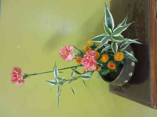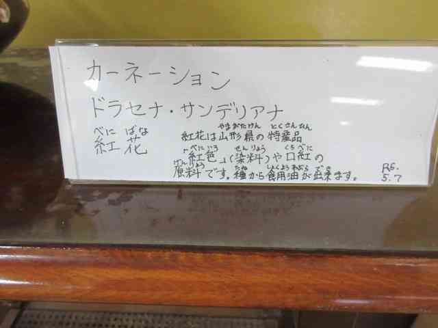 今日のお花は、 カーネーション、ドラセナ・サンデリアナ、紅花です。 (紅花についての説明を書き添えてくださいました。) 明日からの授業参観・懇談会、 5月第2日曜日の母の日も意識され、 カーネーションを中心に生けてくださいました。 職員玄関、水槽の横に飾られていますので、 ぜひご覧ください。