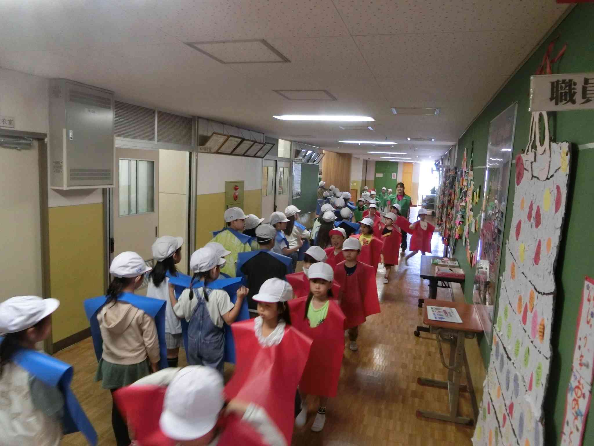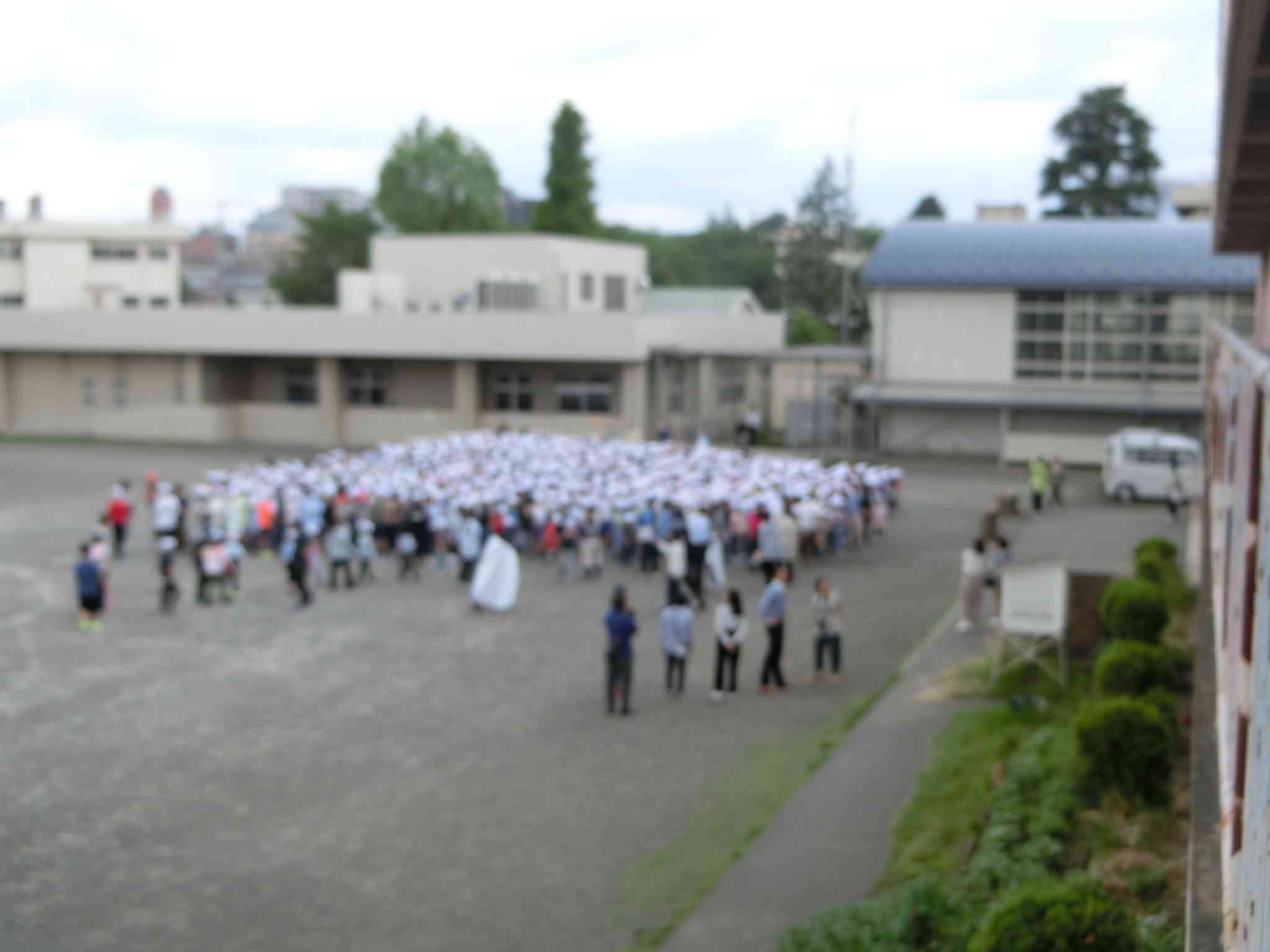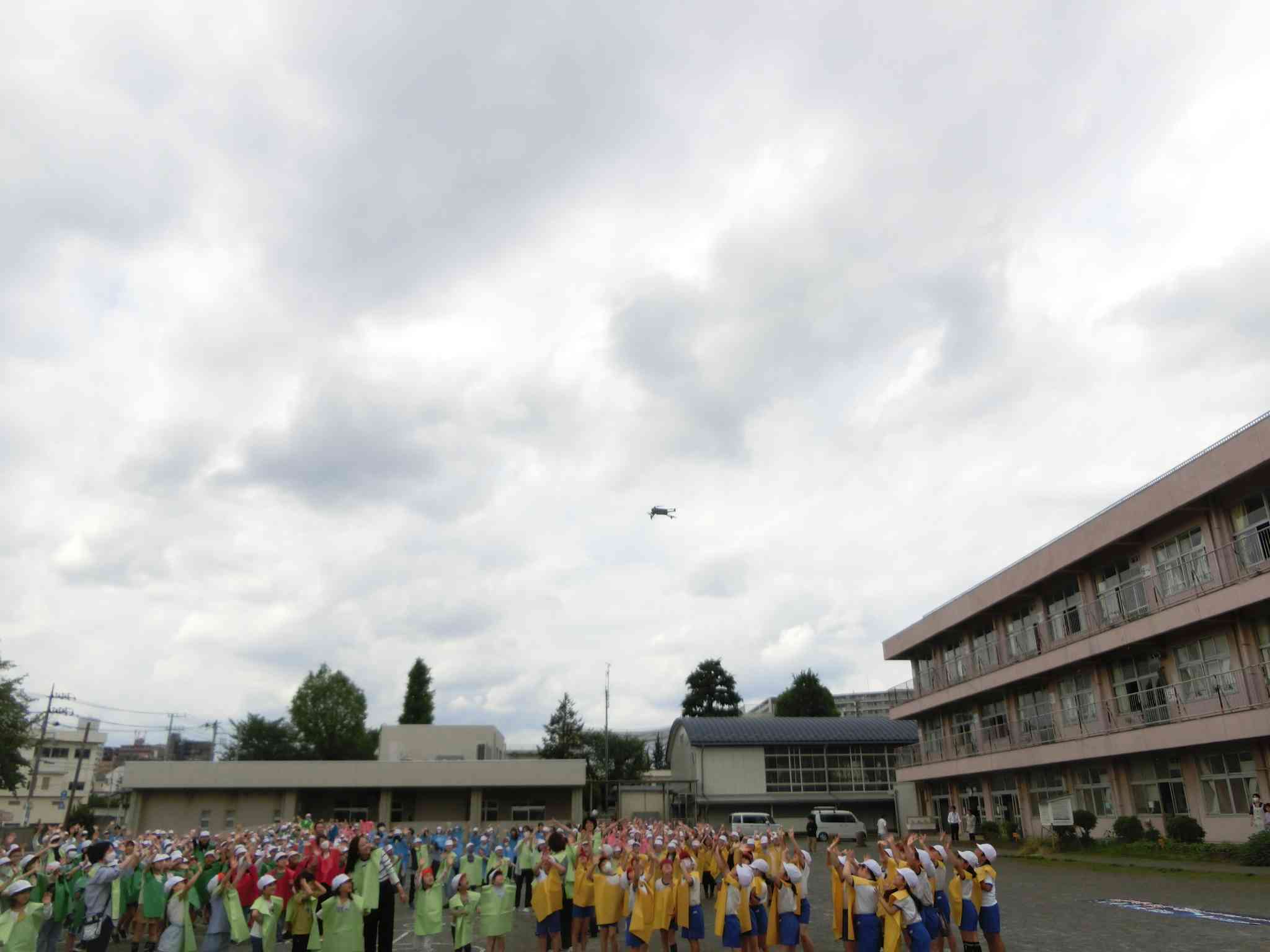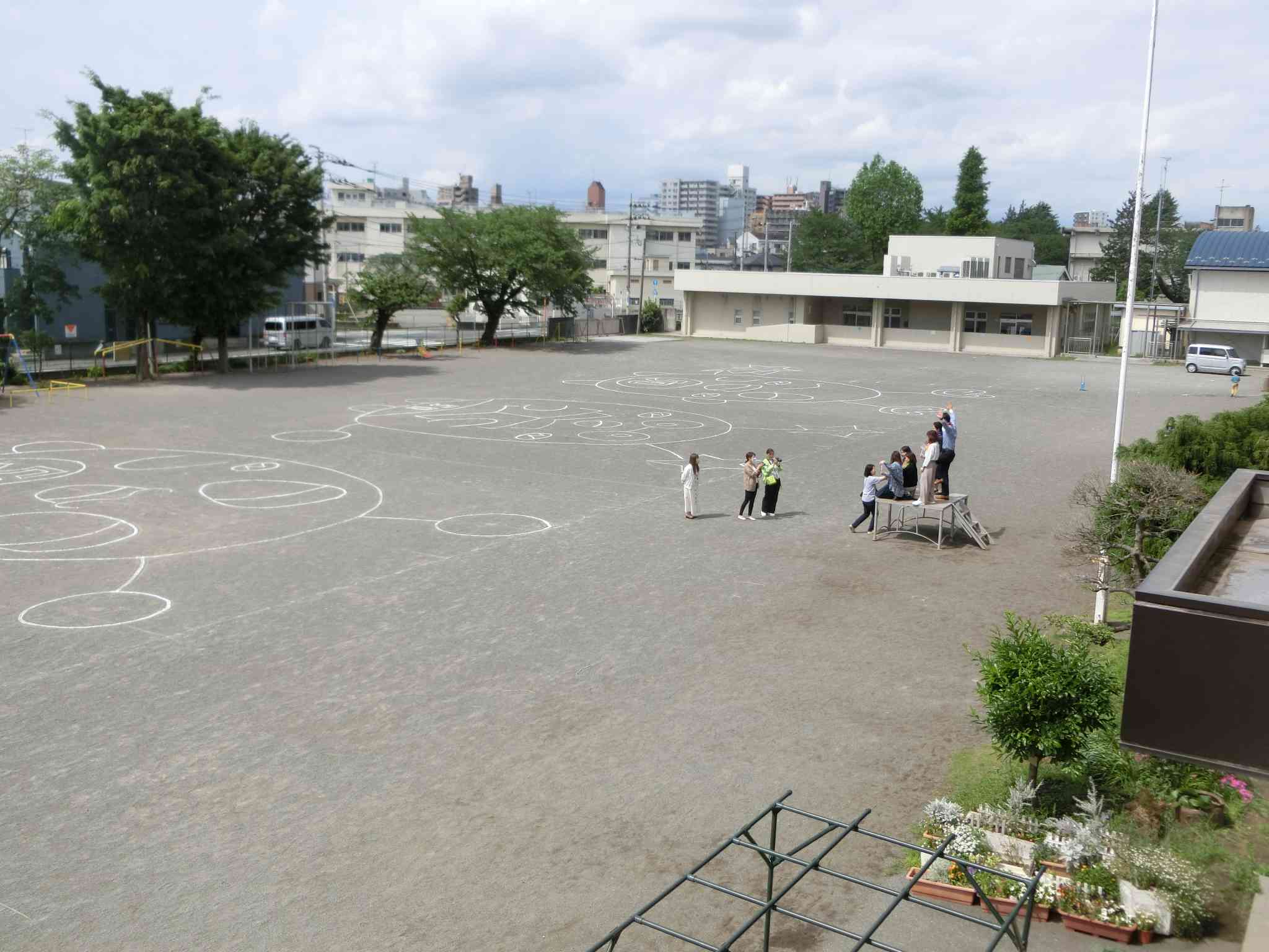 ドローンで上空から写真撮影を行いました。 校庭に描いたのは「ポンカブス」子どもが考えた50周年の大野北小のキャラクターマスコット4体です!