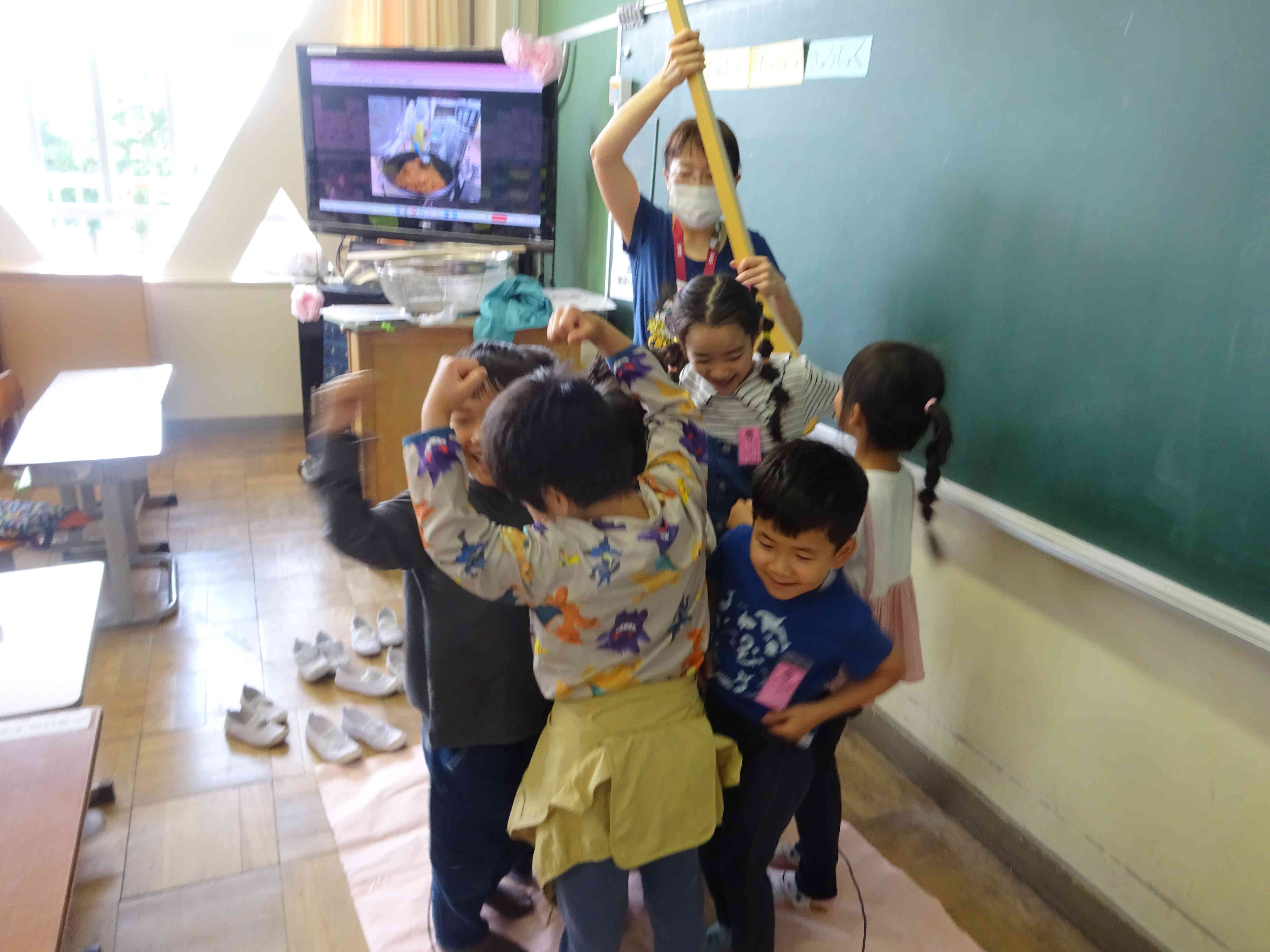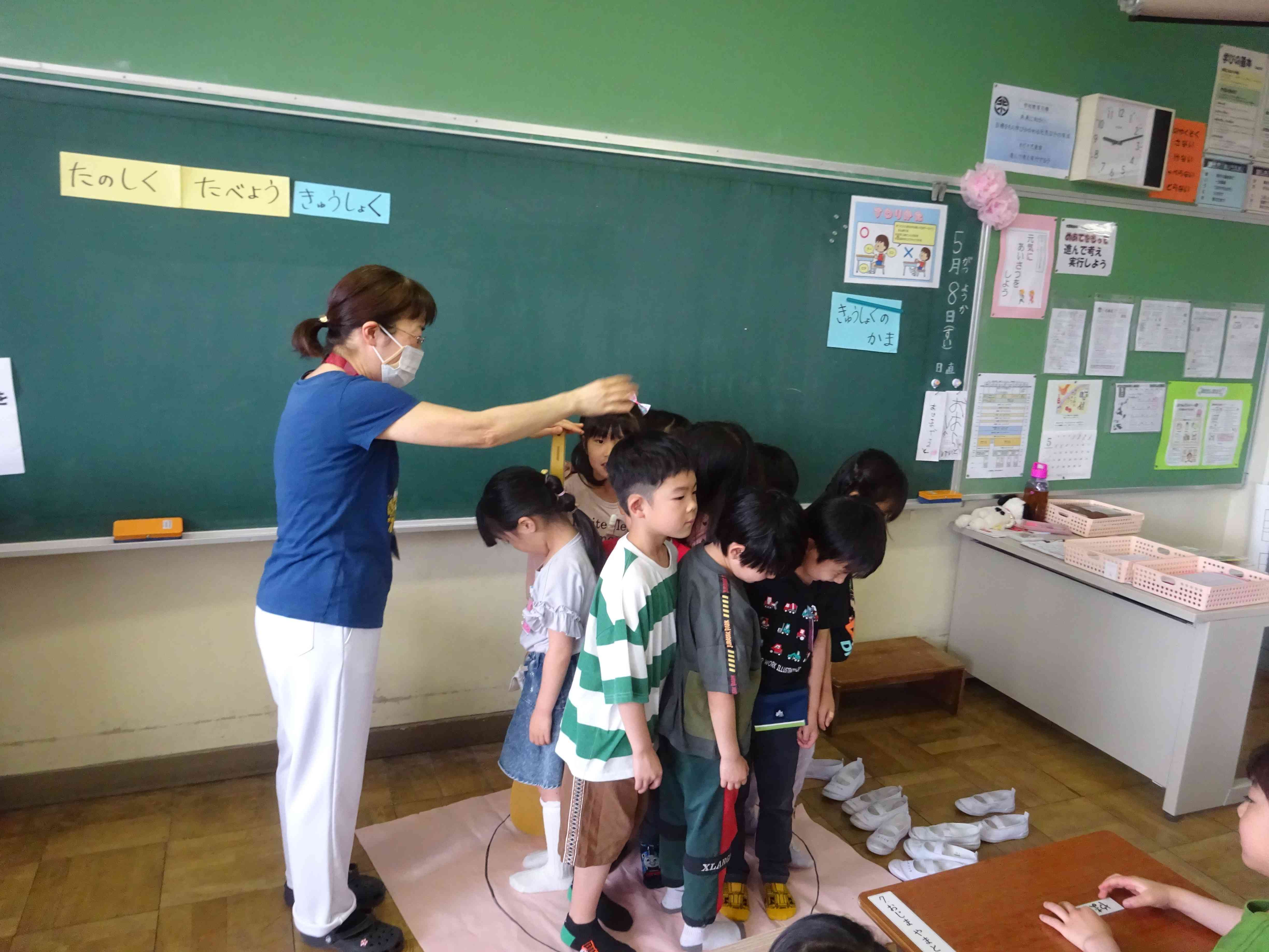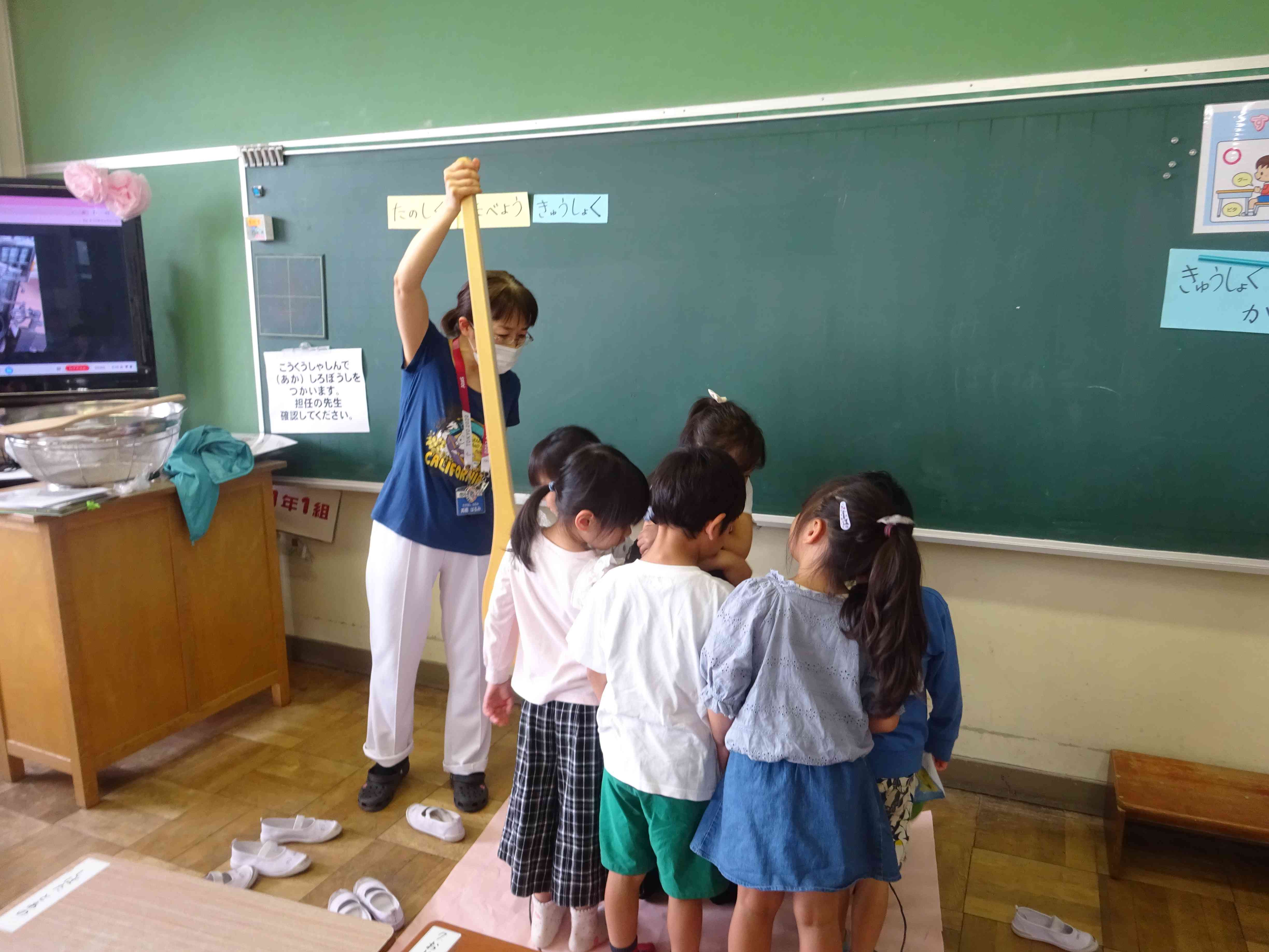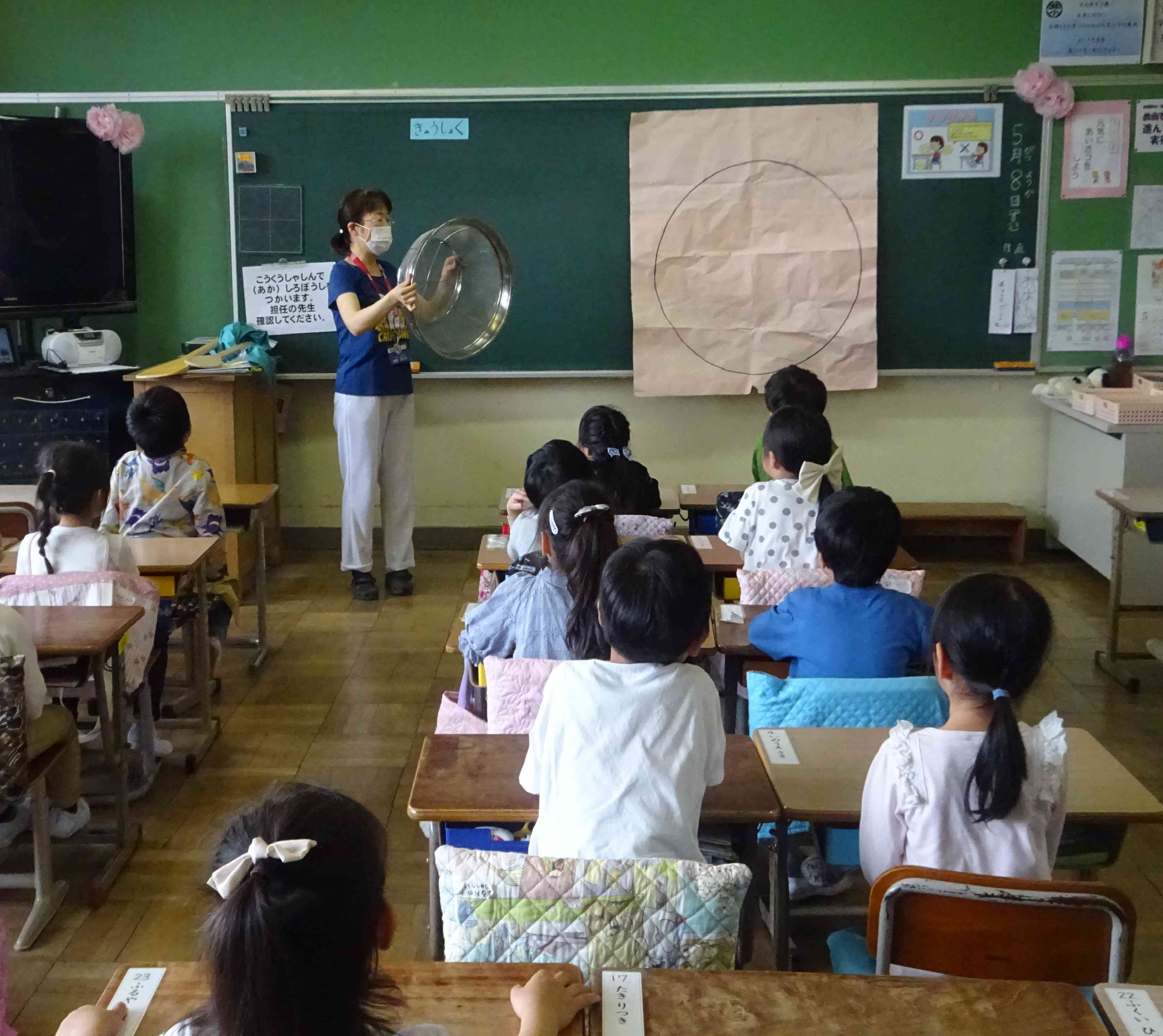 栄養教諭に給食についてのお話を聞きました。 給食室の中でどのようにして給食をつくっているのか、何人でつくっているのか、どのくらい野菜を使っているのかなどたくさんのお話を聞いて、1年生はさらに給食について興味津々になりました。 さらに給食室で使うお鍋の大きさを教えてもらうだけでなくみんなで大きさを体験でき、大盛り上がりでした。 もっともっと給食を大好きになって、おいしい給食をたくさん食べようと話していました。【添付ファイル】