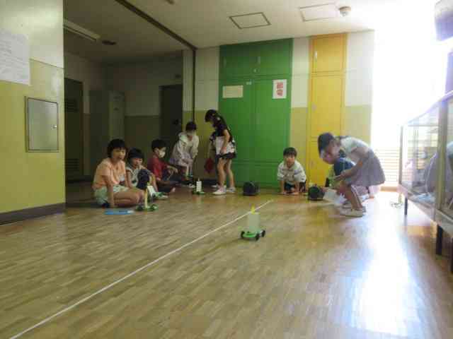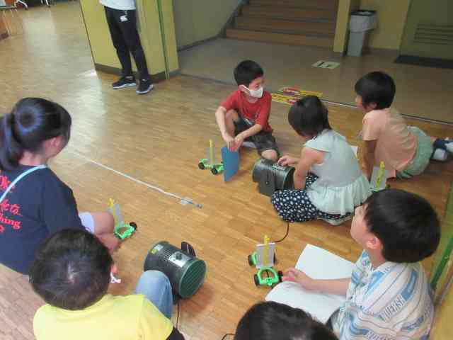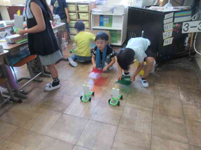 理科の学習で、 風の力で車を動かしました。 どのように風を当てると遠くまで走るか、 実験しました。